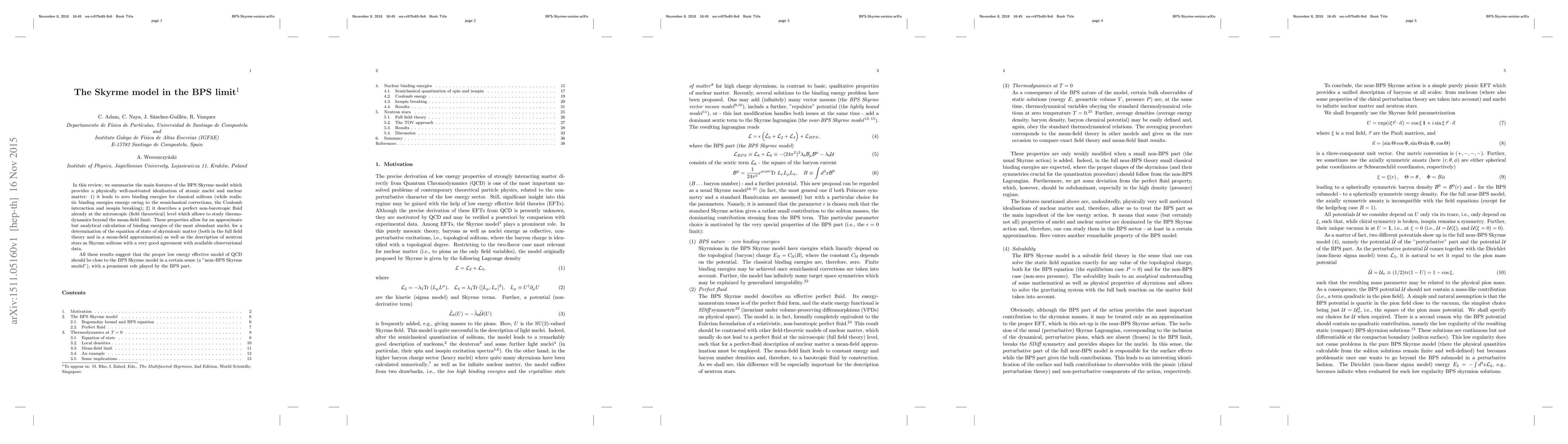 This paper reviews the BPS Skyrme model, which idealizes atomic nuclei and nuclear matter by yielding zero binding energies for classical solitons and describing a perfect non-barotropic fluid, enabling analytical calculations of nuclear binding energies and neutron star descriptions with good observational agreement. The model suggests that the low energy effective model of QCD is close to the BPS Skyrme model.