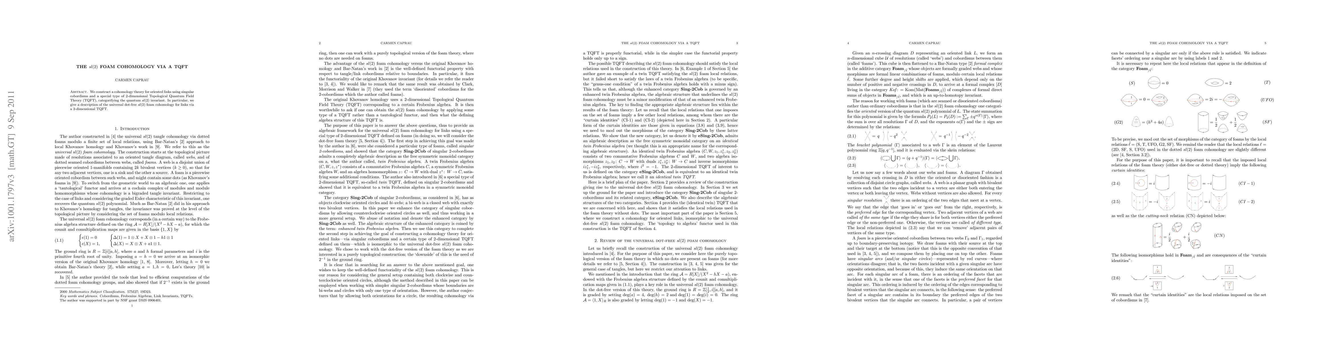 We construct a cohomology theory for oriented links using singular cobordisms and a special type of 2-dimensional Topological Quantum Field Theory (TQFT), categorifying the quantum sl(2) invariant. In particular, we give a description of the universal dot-free sl(2) foam cohomology for links via a TQFT.