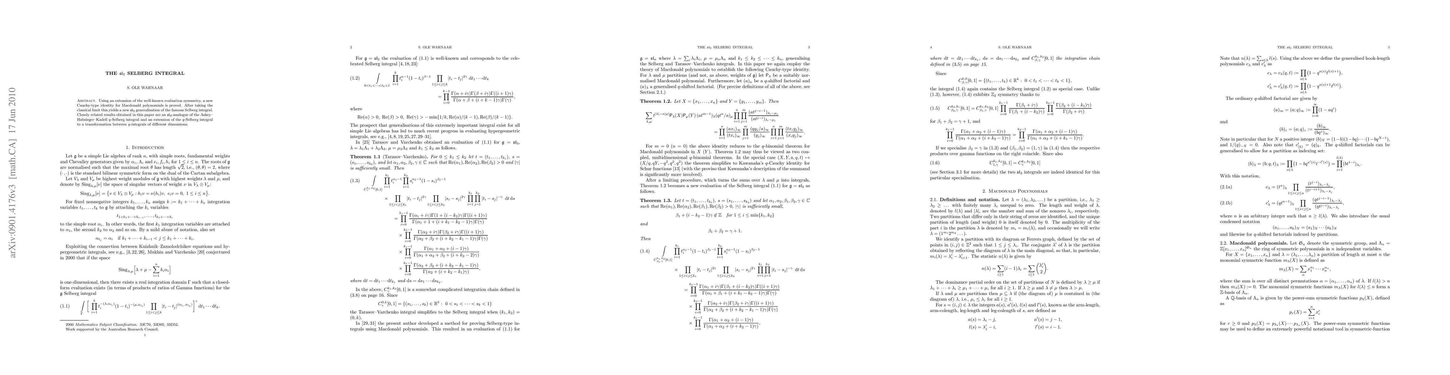 Using an extension of the well-known evaluation symmetry, a new Cauchy-type identity for Macdonald polynomials is proved. After taking the classical limit this yields a new sl_3 generalisation of the famous Selberg integral. Closely related results obtained in this paper are an sl_3-analogue of the Askey-Habsieger-Kadell q-Selberg integral and an extension of the q-Selberg integral to a transformation between q-integrals of different dimensions.