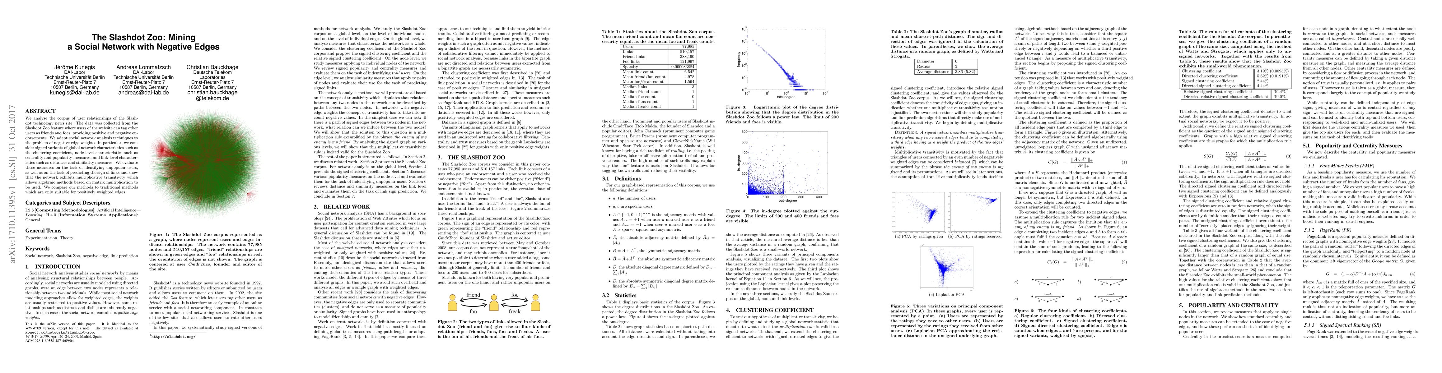 We analyse the corpus of user relationships of the Slashdot technology news site. The data was collected from the Slashdot Zoo feature where users of the website can tag other users as friends and foes, providing positive and negative endorsements. We adapt social network analysis techniques to the problem of negative edge weights. In particular, we consider signed variants of global network characteristics such as the clustering coefficient, node-level characteristics such as centrality and popularity measures, and link-level characteristics such as distances and similarity measures. We evaluate these measures on the task of identifying unpopular users, as well as on the task of predicting the sign of links and show that the network exhibits multiplicative transitivity which allows algebraic methods based on matrix multiplication to be used. We compare our methods to traditional methods which are only suitable for positively weighted edges.