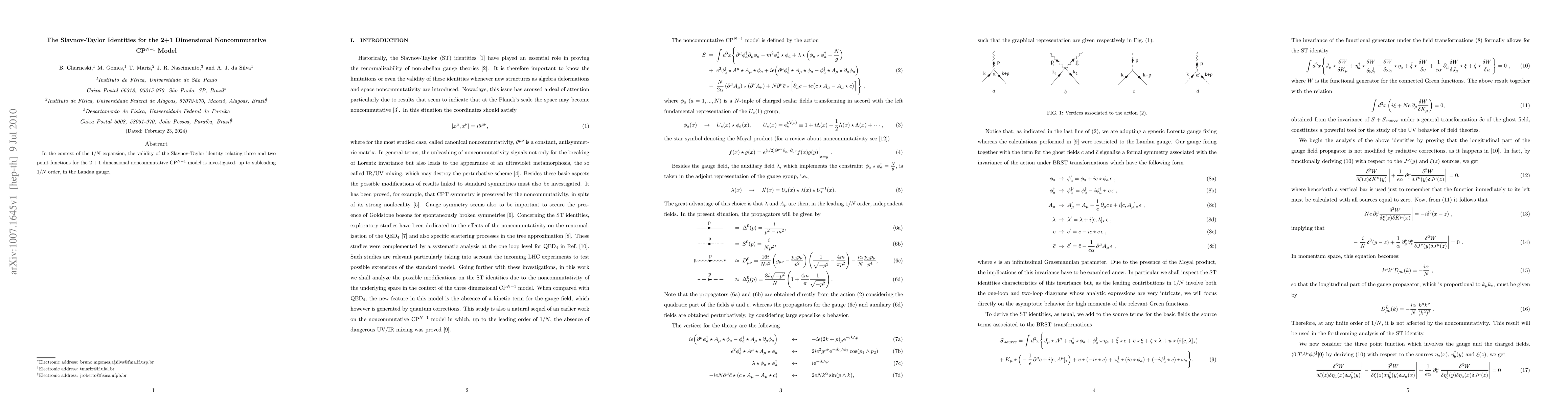 This study examines the Slavnov-Taylor identities in the $2+1$ dimensional noncommutative CP$^{N-1}$ model under the $1/N$ expansion, confirming their validity up to subleading $1/N$ order in the Landau gauge. The research focuses on the relationship between three and two point functions.