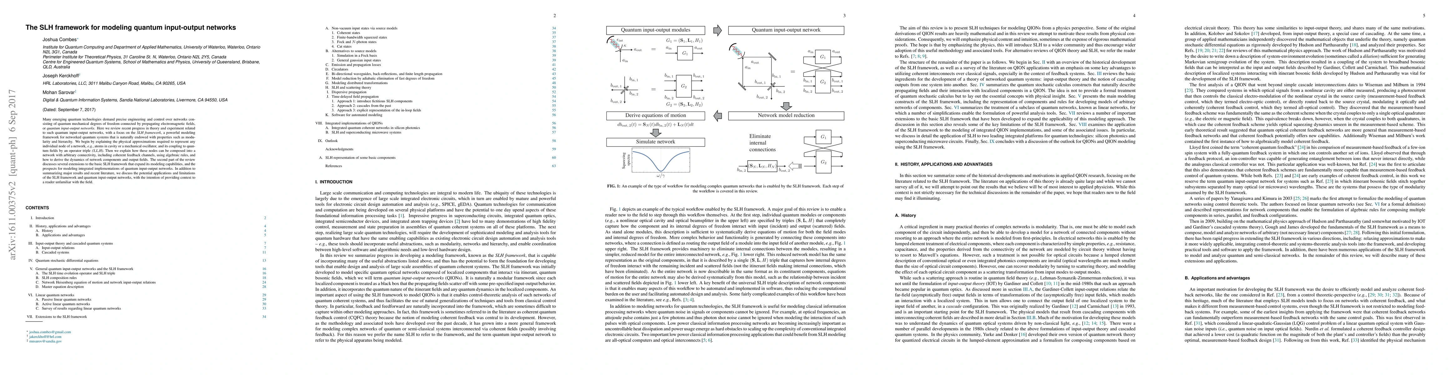 Many emerging quantum technologies demand precise engineering and control over networks consisting of quantum mechanical degrees of freedom connected by propagating electromagnetic fields, or quantum input-output networks. Here we review recent progress in theory and experiment related to such quantum input-output networks, with a focus on the SLH framework, a powerful modeling framework for networked quantum systems that is naturally endowed with properties such as modularity and hierarchy. We begin by explaining the physical approximations required to represent any individual node of a network, eg. atoms in cavity or a mechanical oscillator, and its coupling to quantum fields by an operator triple $(S,L,H)$. Then we explain how these nodes can be composed into a network with arbitrary connectivity, including coherent feedback channels, using algebraic rules, and how to derive the dynamics of network components and output fields. The second part of the review discusses several extensions to the basic SLH framework that expand its modeling capabilities, and the prospects for modeling integrated implementations of quantum input-output networks. In addition to summarizing major results and recent literature, we discuss the potential applications and limitations of the SLH framework and quantum input-output networks, with the intention of providing context to a reader unfamiliar with the field.