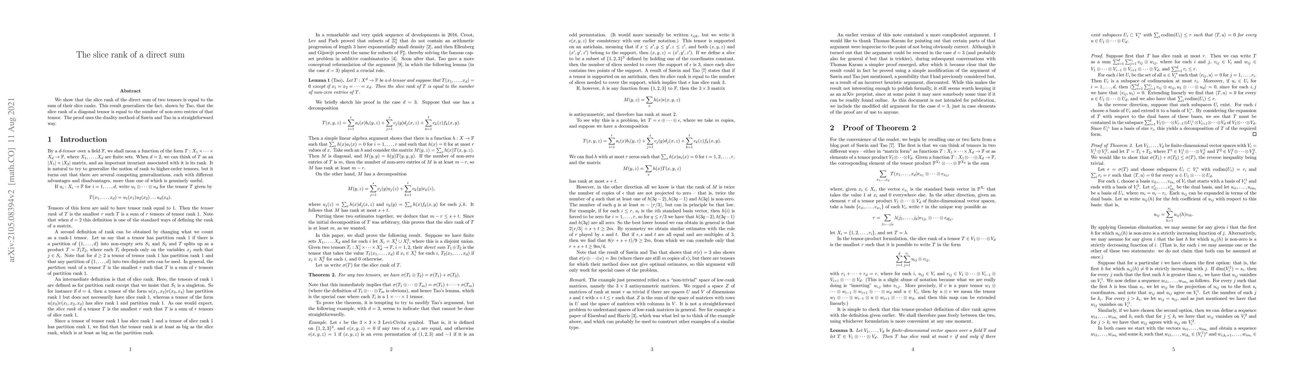 The paper demonstrates that the slice rank of the direct sum of two tensors equals the sum of their individual slice ranks. This result extends a previous finding by Tao regarding diagonal tensors.