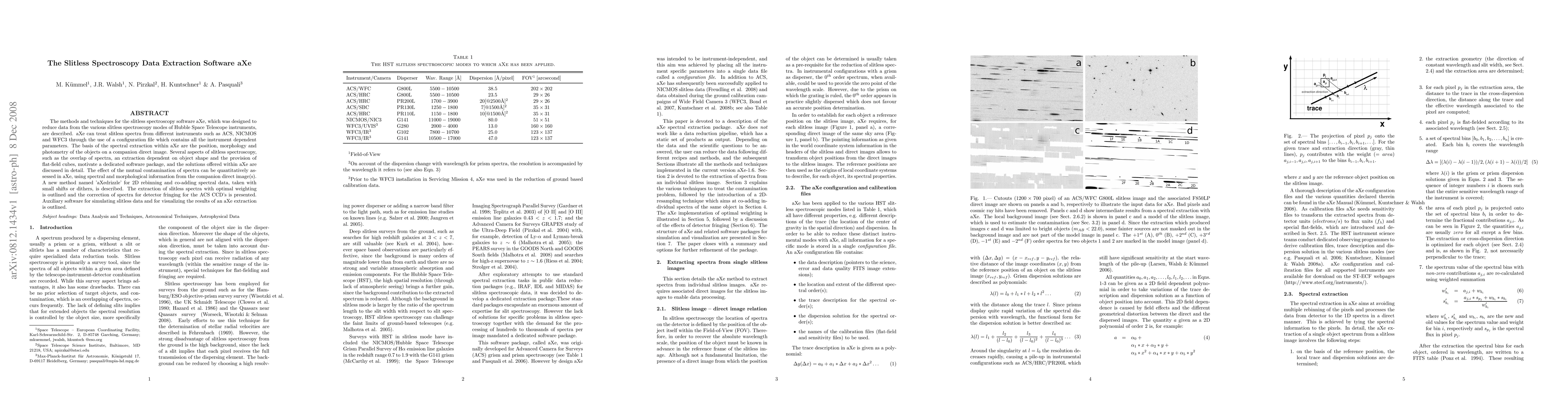 The paper describes the methods and techniques for the slitless spectroscopy software aXe, designed for reducing data from Hubble Space Telescope instruments like ACS, NICMOS, and WFC3. It details spectral extraction based on object position, morphology, and photometry from a companion direct image, addressing issues like spectral overlap and detector fringing.