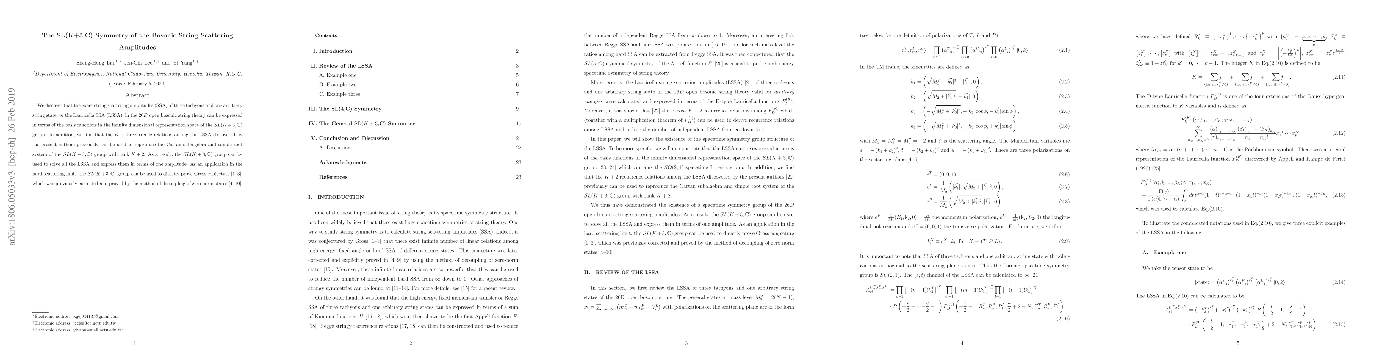 We discover that the exact string scattering amplitudes (SSA) of three tachyons and one arbitrary string state, or the Lauricella SSA (LSSA), in the 26D open bosonic string theory can be expressed in terms of the basis functions in the infinite dimensional representation space of the SL(K+3,C) group. In addition, we find that the K+2 recurrence relations among the LSSA discovered by the present authors previously can be used to reproduce the Cartan subalgebra and simple root system of the SL(K+3,C) group with rank K+2. As a result, the SL(K+3,C) group can be used to solve all the LSSA and express them in terms of one amplitude. As an application in the hard scattering limit, the SL(K+3,C) group can be used to directly prove Gross conjecture [1-3], which was previously corrected and proved by the method of decoupling of zero norm states [4-10].