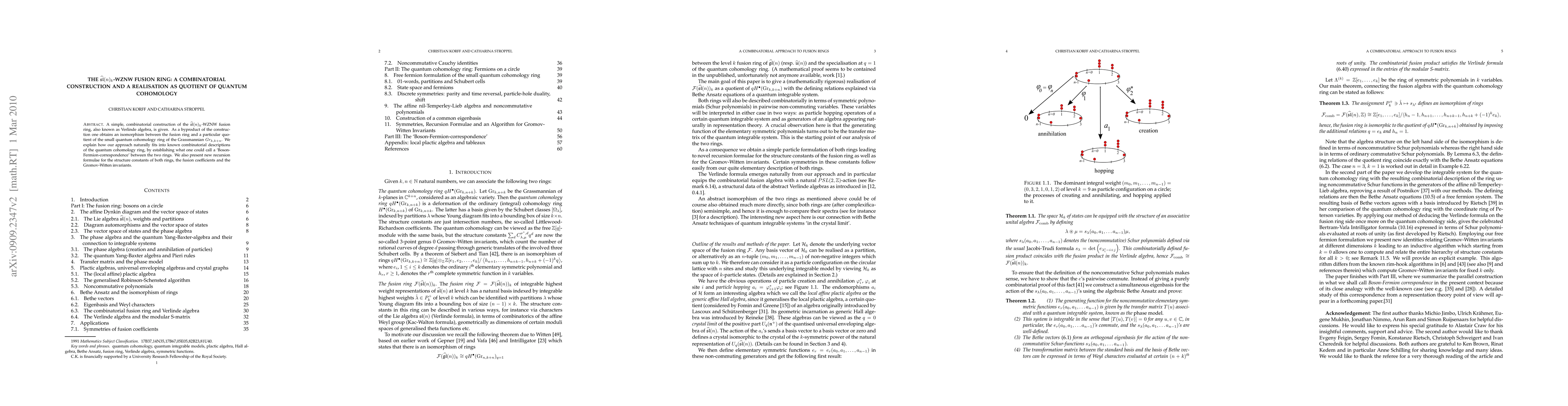The paper presents a combinatorial construction of the sl(n)-WZNW fusion ring and establishes an isomorphism between it and a quotient of the Grassmannian's small quantum cohomology ring, providing new recursion formulae for structure constants and Gromov-Witten invariants.