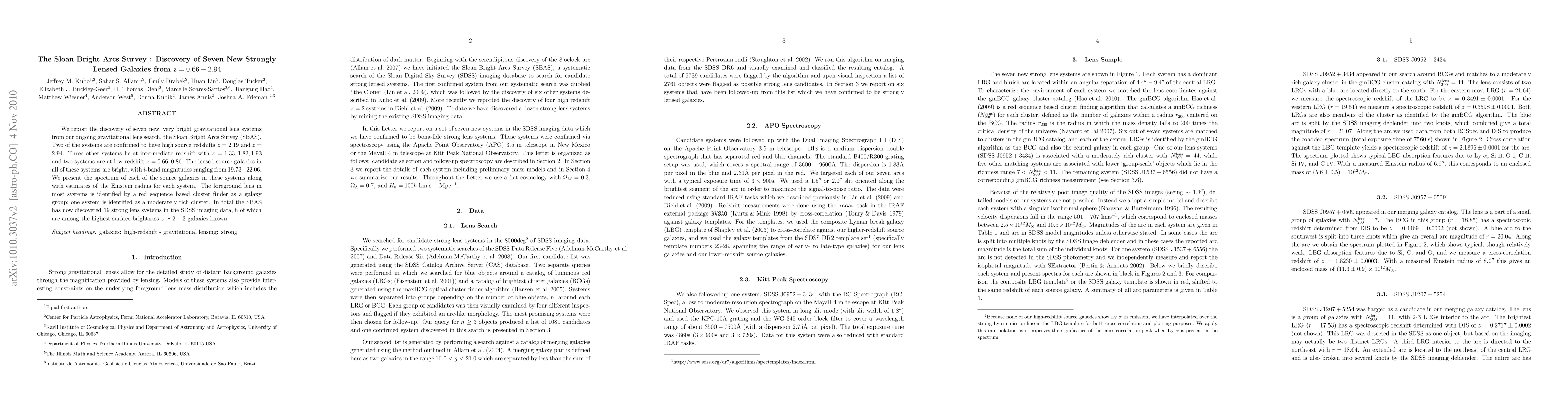 We report the discovery of seven new, very bright gravitational lens systems from our ongoing gravitational lens search, the Sloan Bright Arcs Survey (SBAS). Two of the systems are confirmed to have high source redshifts z=2.19 and z=2.94. Three other systems lie at intermediate redshift with z=1.33,1.82,1.93 and two systems are at low redshift z=0.66,0.86. The lensed source galaxies in all of these systems are bright, with i-band magnitudes ranging from 19.73-22.06. We present the spectrum of each of the source galaxies in these systems along with estimates of the Einstein radius for each system. The foreground lens in most systems is identified by a red sequence based cluster finder as a galaxy group; one system is identified as a moderately rich cluster. In total the SBAS has now discovered 19 strong lens systems in the SDSS imaging data, 8 of which are among the highest surface brightness z\simeq2-3 galaxies known.