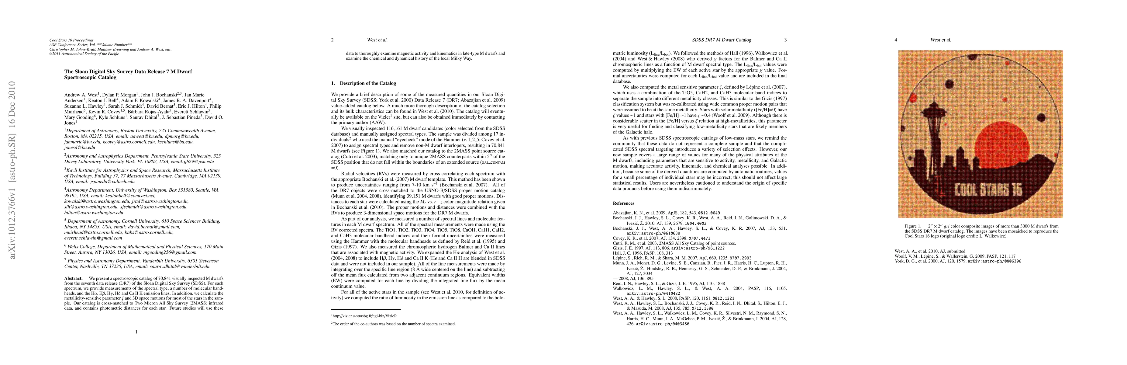 The Sloan Digital Sky Survey Data Release 7 M Dwarf Spectroscopic Catalog presents a catalog of 70,841 M dwarfs with detailed spectroscopic measurements, including spectral types, molecular bandheads, and emission lines, along with metallicity and space motion data. Cross-matched with 2MASS infrared data, it aims to study magnetic activity and the Milky Way's chemical and dynamical history.