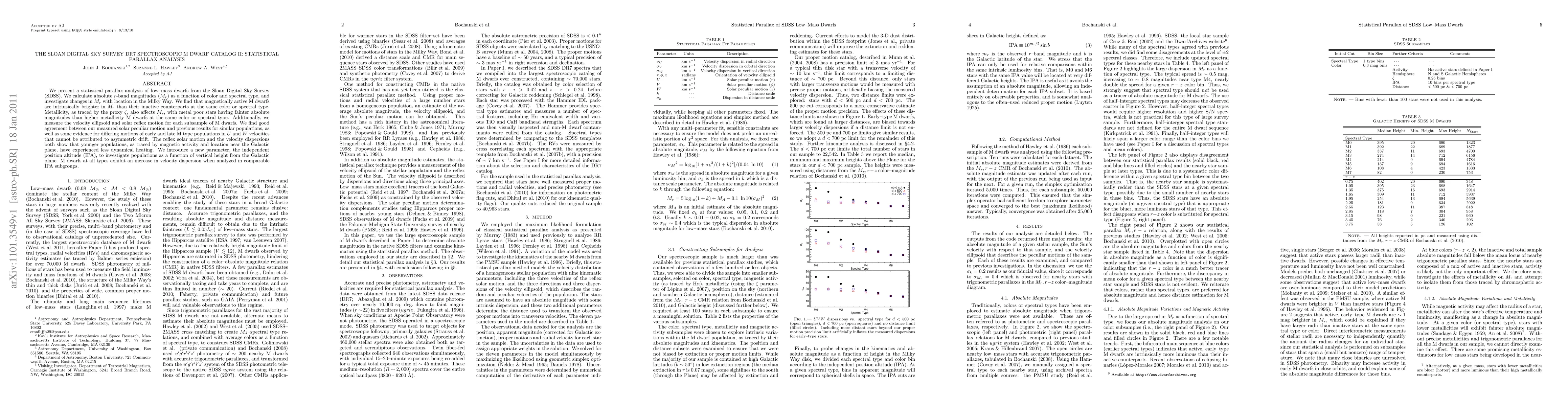 We present a statistical parallax analysis of low-mass dwarfs from the Sloan Digital Sky Survey (SDSS). We calculate absolute r-band magnitudes (M_r) as a function of color and spectral type, and investigate changes in M_r with location in the Milky Way. We find that magnetically active M dwarfs are intrinsically brighter in M_r than their inactive counterparts at the same color or spectral type. Metallicity, as traced by the proxy zeta, also affects M_r, with metal poor stars having fainter absolute magnitudes than higher metallicity M dwarfs at the same color or spectral type. Additionally, we measure the velocity ellipsoid and solar reflex motion for each subsample of M dwarfs. We find good agreement between our measured solar peculiar motion and previous results for similar populations, as well as some evidence for differing motions of early and late M type populations in U and W velocities that cannot be attributed to asymmetric drift. The reflex solar motion and the velocity dispersions both show that younger populations, as traced by magnetic activity and location near the Galactic plane, have experienced less dynamical heating. We introduce a new parameter, the independent position altitude (IPA), to investigate populations as a function of vertical height from the Galactic plane. M dwarfs at all types exhibit an increase in velocity dispersion when analyzed in comparable IPA subgroups.