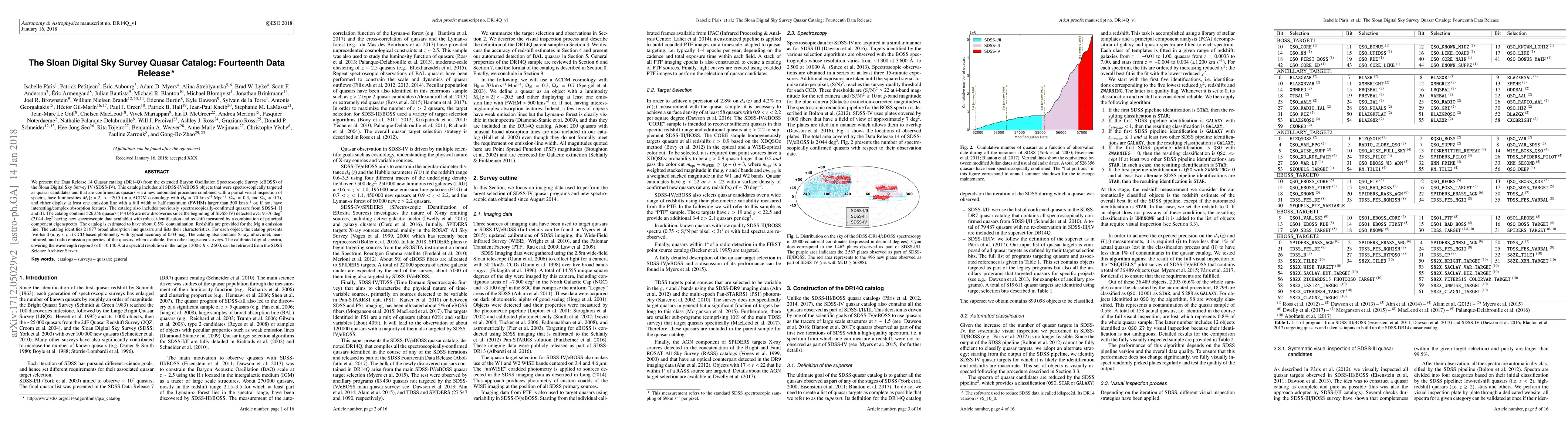 The Sloan Digital Sky Survey's fourteenth data release includes a comprehensive quasar catalog (DR14Q) from the eBOSS survey, featuring 526,356 quasars, of which 144,046 are new discoveries. The catalog provides detailed multi-wavelength properties and robust redshift measurements.