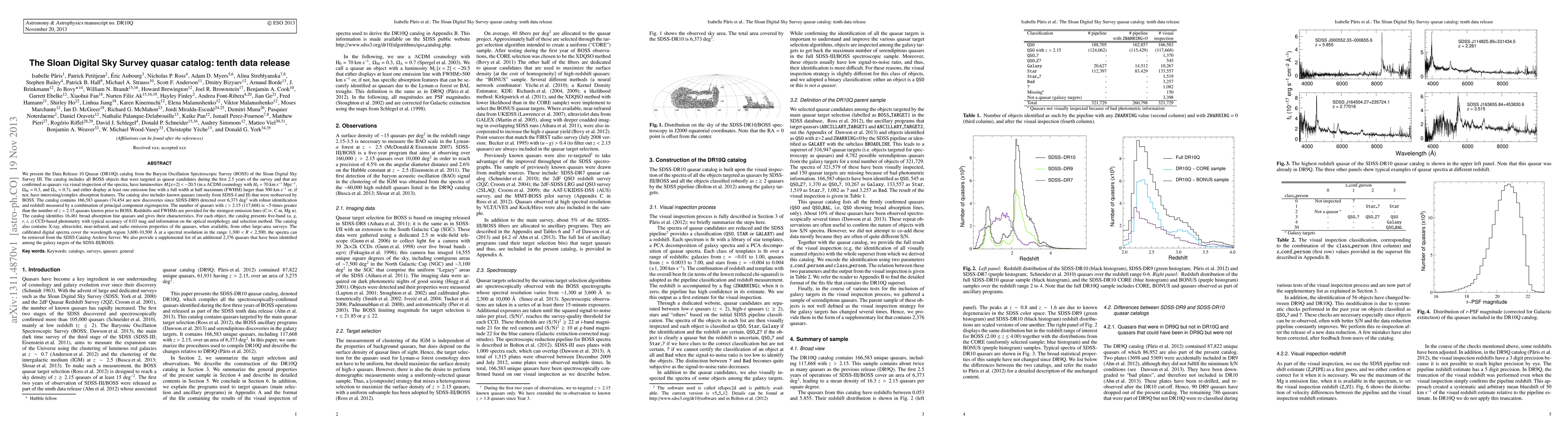 The Sloan Digital Sky Survey's tenth data release includes a comprehensive catalog of 166,583 quasars, significantly expanding the known population of high-redshift quasars, with detailed spectral and photometric data for each object. The catalog also features additional quasars identified among galaxy targets.