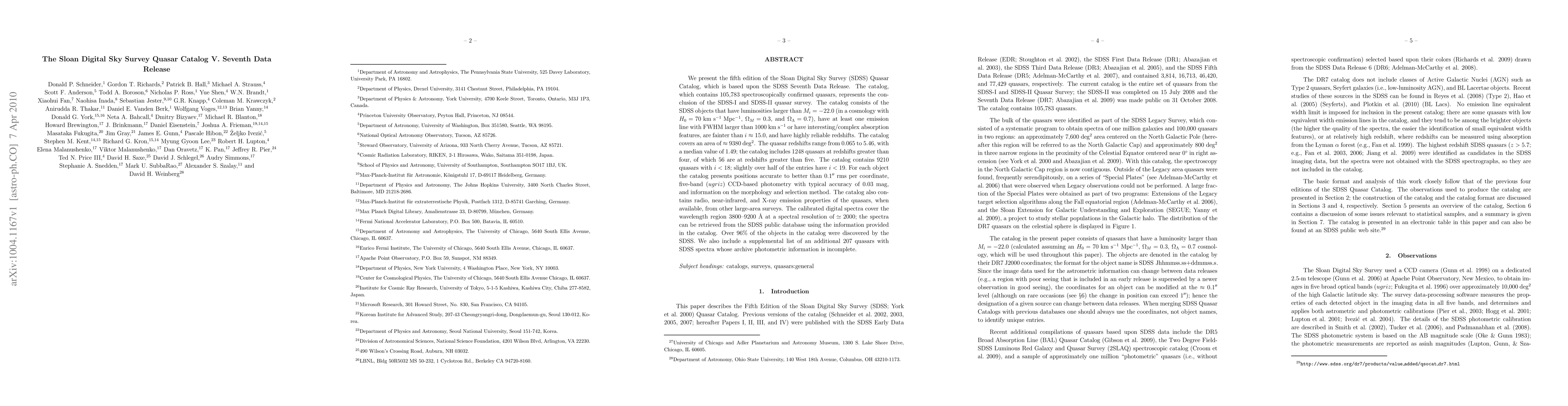 The Sloan Digital Sky Survey Quasar Catalog V. Seventh Data Release presents a comprehensive catalog of 105,783 quasars, marking the completion of the SDSS-I and SDSS-II quasar survey, with detailed multi-wavelength data and calibrated digital spectra available for public access.