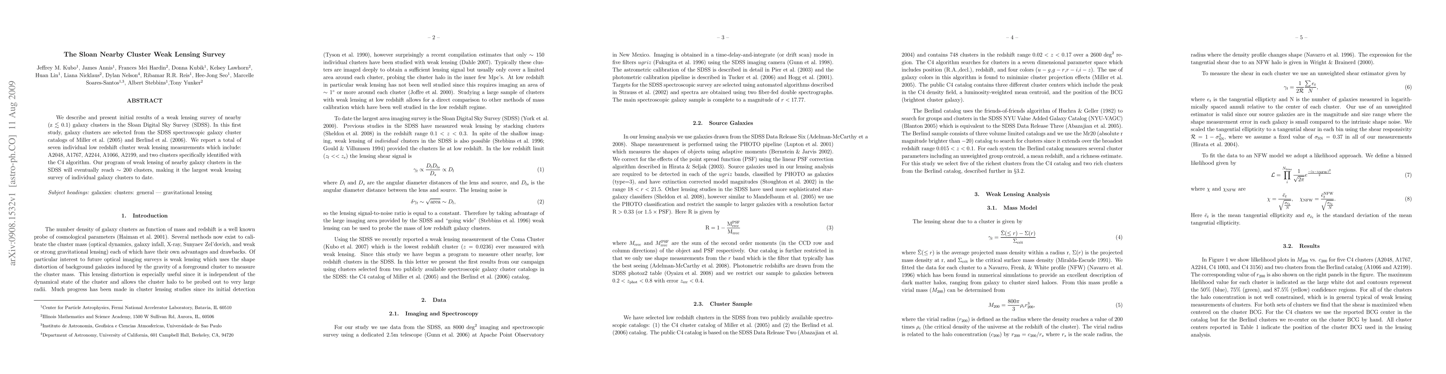 This paper presents initial results from a weak lensing survey of nearby galaxy clusters in the Sloan Digital Sky Survey, focusing on seven low redshift clusters. The study aims to eventually cover around 200 clusters, making it the largest weak lensing survey of individual galaxy clusters to date.