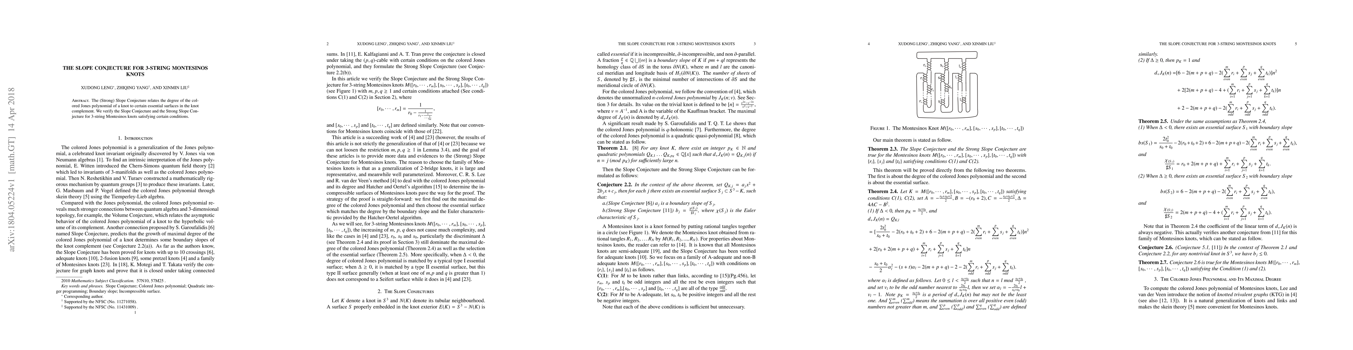 Summary: This paper verifies the Slope Conjecture and the Strong Slope Conjecture for 3-string Montesinos knots under specified conditions, linking the knot's colored Jones polynomial degree to essential surfaces in its complement.