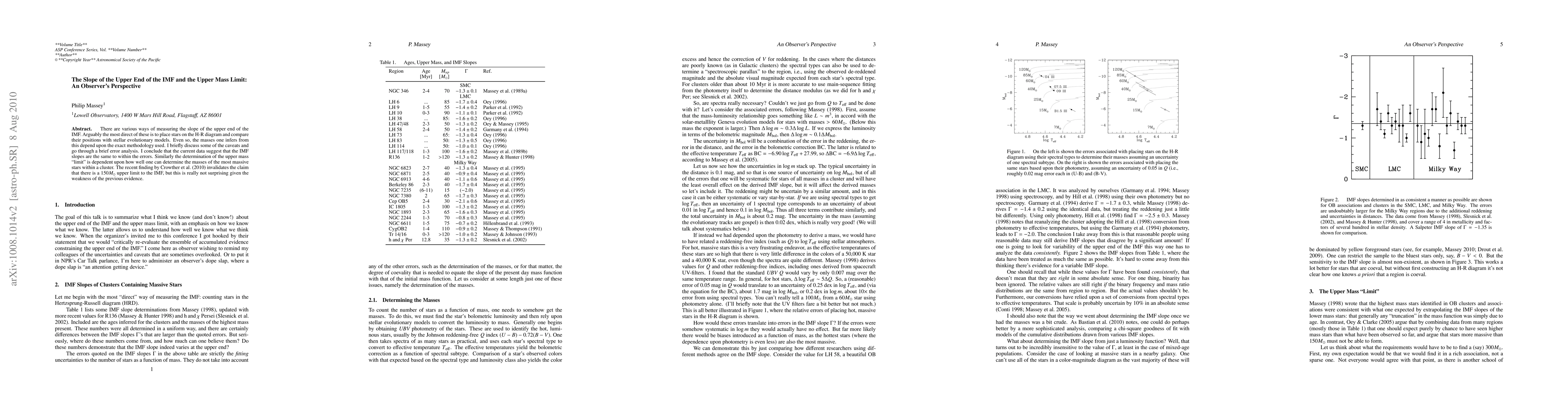 There are various ways of measuring the slope of the upper end of the IMF. Arguably the most direct of these is to place stars on the H-R diagram and compare their positions with stellar evolutionary models. Even so, the masses one infers from this depend upon the exact methodology used. I briefly discusssome of the caveats and go through a brief error analysis. I conclude that the current data suggest that the IMF slopes are the same to within the errors. Similarly the determination of the upper mass "limit" is dependent upon how well one can determine the masses of the most massive stars within a cluster. The recent finding by Crowther et al (2010) invalidates the claim that there is a 150Mo upper limit to the IMF, but this is really not surprising given the weakness of the previous evidence.