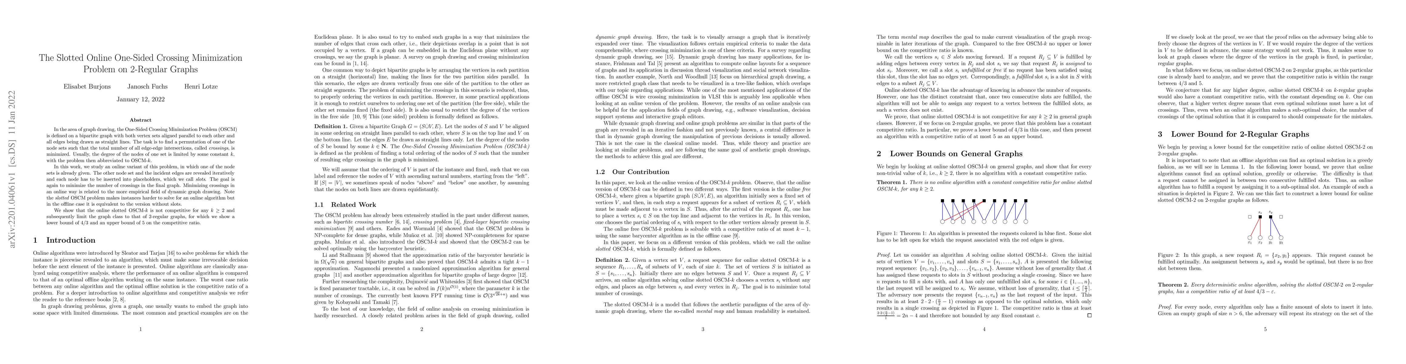 This paper explores the online slotted One-Sided Crossing Minimization Problem (OSCM) on 2-regular graphs, where nodes are revealed iteratively and must be inserted into predefined slots. It demonstrates that the problem is not competitive for any k ≥ 2 and establishes bounds of 4/3 and 5 for the competitive ratio on 2-regular graphs.