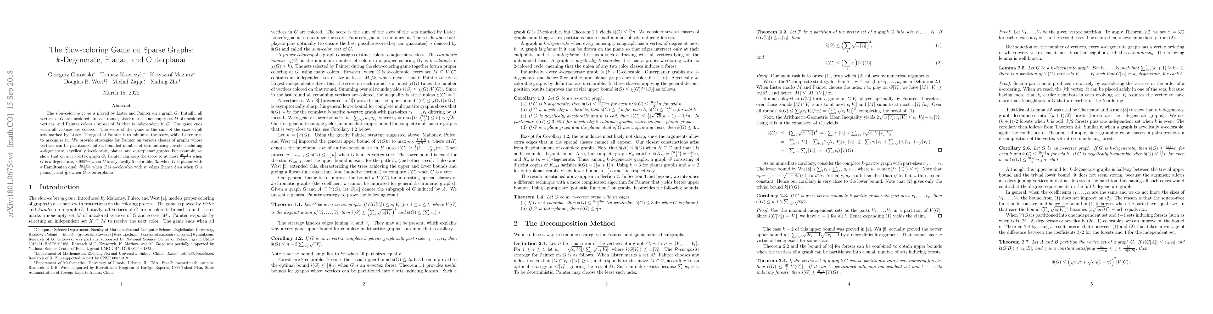 The paper explores strategies for Painter in the slow-coloring game on various sparse graph classes, including $k$-degenerate, planar, and outerplanar graphs. Painter can minimize the game score effectively, achieving bounds such as $\frac{3k+4}4n$ for $k$-degenerate graphs.