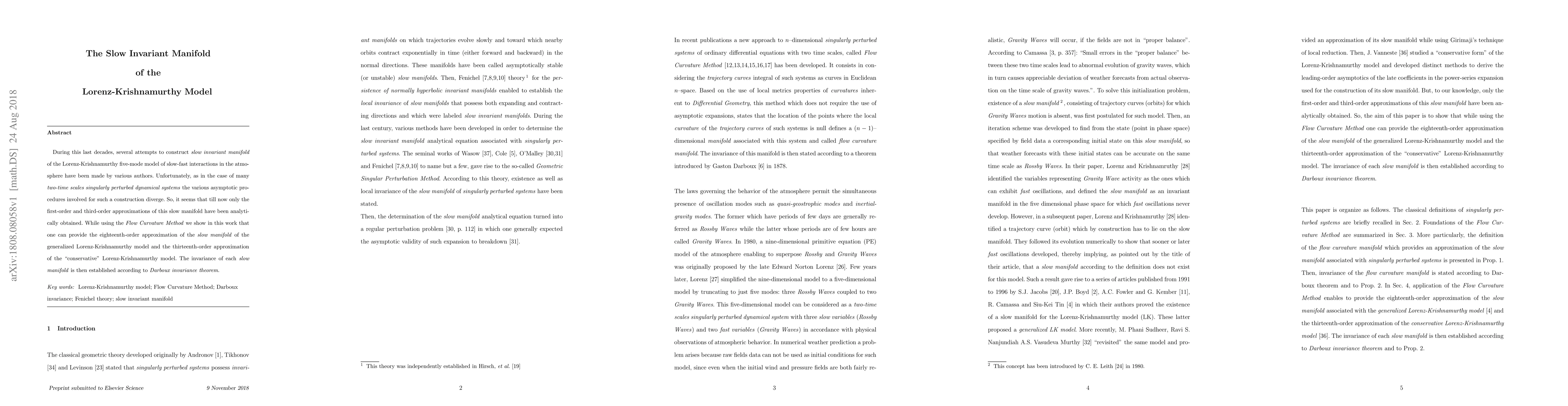 During this last decades, several attempts to construct slow invariant manifold of the Lorenz-Krishnamurthy five-mode model of slow-fast interactions in the atmosphere have been made by various authors. Unfortunately, as in the case of many two-time scales singularly perturbed dynamical systems the various asymptotic procedures involved for such a construction diverge. So, it seems that till now only the first-order and third-order approximations of this slow manifold have been analytically obtained. While using the Flow Curvature Method we show in this work that one can provide the eighteenth-order approximation of the slow manifold of the generalized Lorenz-Krishnamurthy model and the thirteenth-order approximation of the "conservative" Lorenz-Krishnamurthy model. The invariance of each slow manifold is then established according to Darboux invariance theorem.
