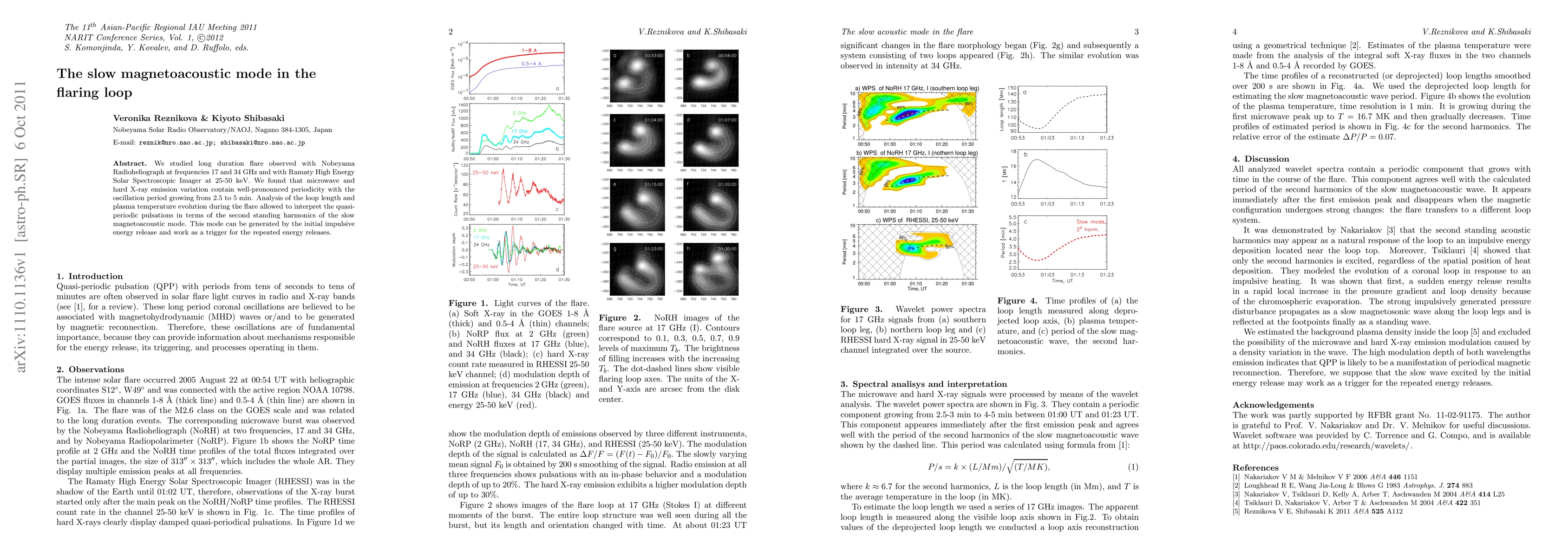 We studied long duration flare observed with Nobeyama Radioheliograph at frequencies 17 and 34 GHz and with Ramaty High Energy Solar Spectroscopic Imager at 25-50 keV. We found that microwave and hard X-ray emission variation contain well-pronounced periodicity with the oscillation period growing from 2.5 to 5 min. Analysis of the loop length and plasma temperature evolution during the flare allowed to interpret the quasi-periodic pulsations in terms of the second standing harmonics of the slow magnetoacoustic mode. This mode can be generated by the initial impulsive energy release and work as a trigger for the repeated energy releases.