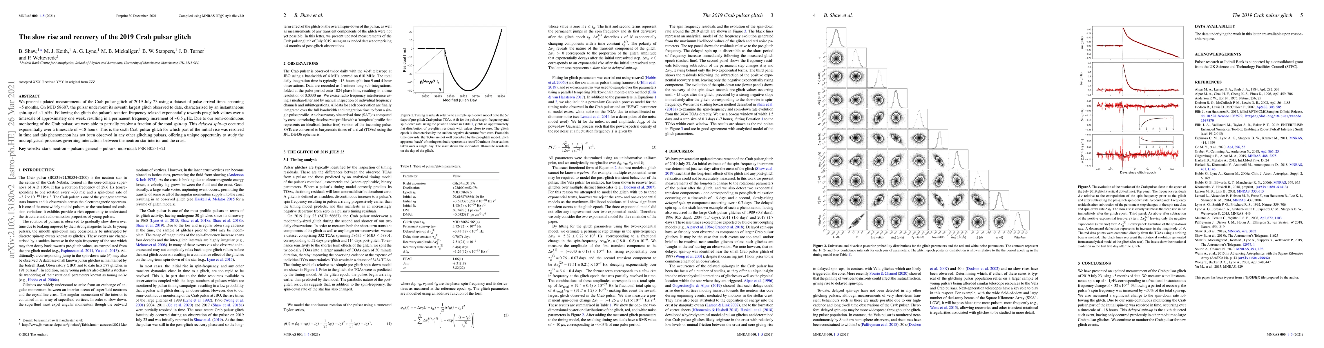 The 2019 Crab pulsar glitch, the seventh largest observed, exhibited an initial spin-up followed by an exponential relaxation over a week, with a permanent frequency increment of 0.5 µHz; a delayed spin-up was also detected over 18 hours, a unique feature among glitching pulsars.