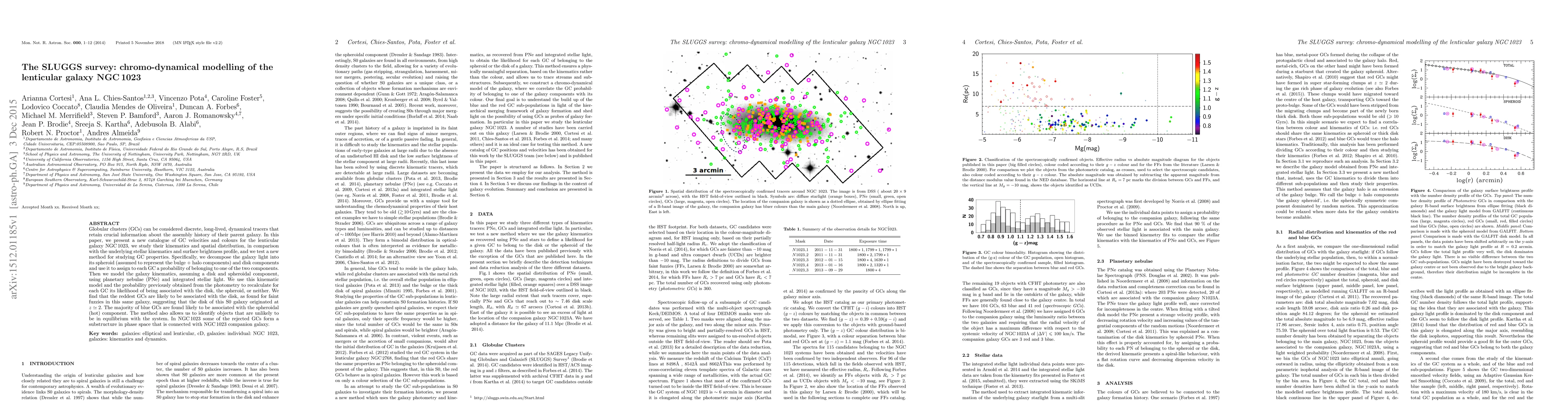 Globular clusters (GCs) can be considered discrete, long-lived, dynamical tracers that retain crucial information about the assembly history of their parent galaxy. In this paper, we present a new catalogue of GC velocities and colours for the lenticular galaxy NGC 1023, we study their kinematics and spatial distribution, in comparison with the underlying stellar kinematics and surface brightness profile, and we test a new method for studying GC properties. Specifically, we decompose the galaxy light into its spheroid (assumed to represent the bulge + halo components) and disk components and use it to assign to each GC a probability of belonging to one of the two components. Then we model the galaxy kinematics, assuming a disk and spheroidal component, using planetary nebulae (PNe) and integrated stellar light. We use this kinematic model and the probability previously obtained from the photometry to recalculate for each GC its likelihood of being associated with the disk, the spheroid, or neither. We find that the reddest GCs are likely to be associated with the disk, as found for faint fuzzies in this same galaxy, suggesting that the disk of this S0 galaxy originated at z ~ 2. The majority of blue GCs are found likely to be associated with the spheroidal (hot) component. The method also allows us to identify objects that are unlikely to be in equilibrium with the system. In NGC1023 some of the rejected GCs form a substructure in phase space that is connected with NGC 1023 companion galaxy.