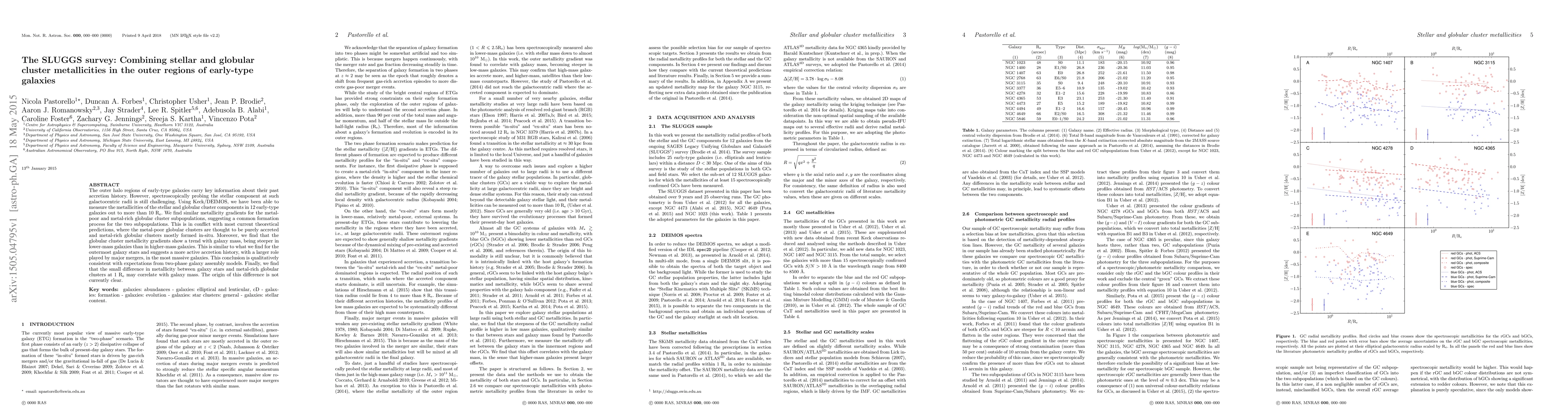The SLUGGS survey measured metallicities of stars and globular clusters in 12 early-type galaxies' outer regions, revealing similar metallicity gradients for both globular cluster subpopulations, contradicting current theories. The study found steeper gradients in lower-mass galaxies, suggesting more active accretion history and major mergers' role in massive galaxies, aligning with two-phase galaxy assembly models.