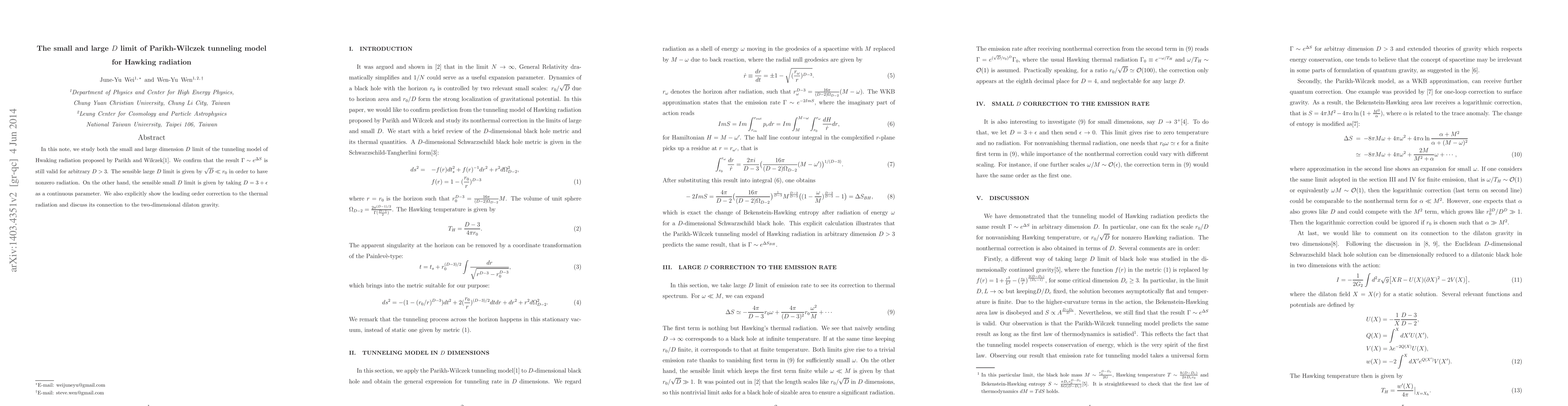 This paper investigates the Parikh-Wilczek tunneling model for Hawking radiation across both small and large dimensions $D$. It confirms that the result $\Gamma \sim e^{\Delta S}$ holds for $D>3$, with the valid large $D$ limit requiring $\sqrt{D} \ll r_0$ for nonzero radiation, and the small $D$ limit approaching $D=3+\epsilon$.