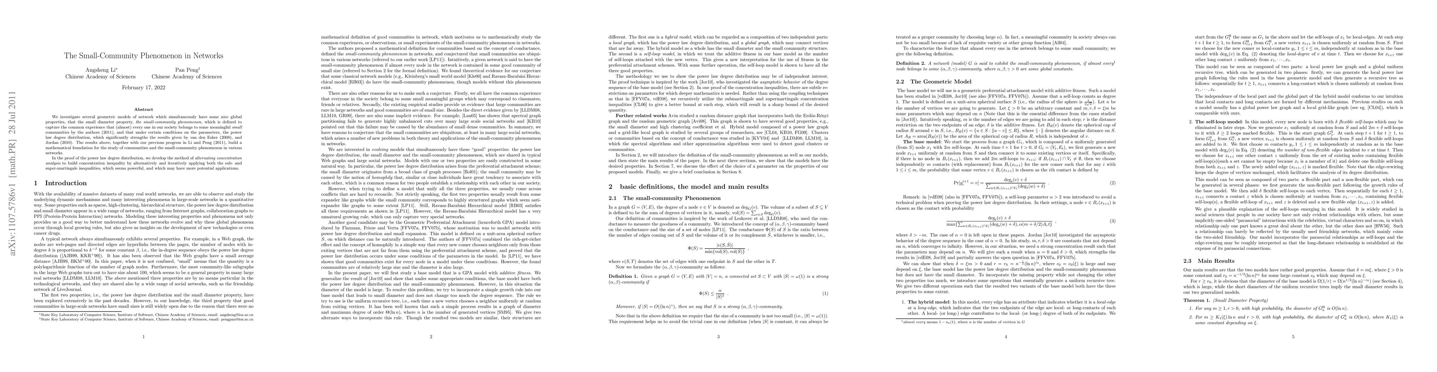 We investigate several geometric models of network which simultaneously have some nice global properties, that the small diameter property, the small-community phenomenon, which is defined to capture the common experience that (almost) every one in our society belongs to some meaningful small communities by the authors (2011), and that under certain conditions on the parameters, the power law degree distribution, which significantly strengths the results given by van den Esker (2008), and Jordan (2010). The results above, together with our previous progress in Li and Peng (2011), build a mathematical foundation for the study of communities and the small-community phenomenon in various networks. In the proof of the power law degree distribution, we develop the method of alternating concentration analysis to build concentration inequality by alternatively and iteratively applying both the sub- and super-martingale inequalities, which seems powerful, and which may have more potential applications.