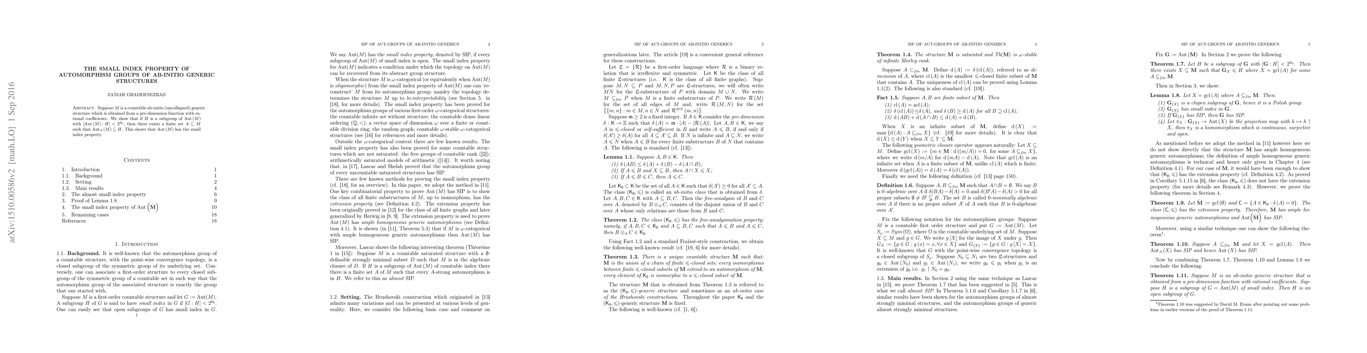 Suppose $M$ is a countable ab-initio (uncollapsed) generic structure which is obtained from a pre-dimension function with rational coefficients. We show that if $H$ is a subgroup of $\mbox{Aut}\left(M\right)$ with $\left[\mbox{Aut}\left(M\right):H\right]<2^{\aleph_{0}}$, then there exists a finite set $A\subseteq M$ such that $\mbox{Aut}_{A}\left(M\right)\subseteq H$. This shows that $\mbox{Aut}\left(M\right)$ has the small index property.