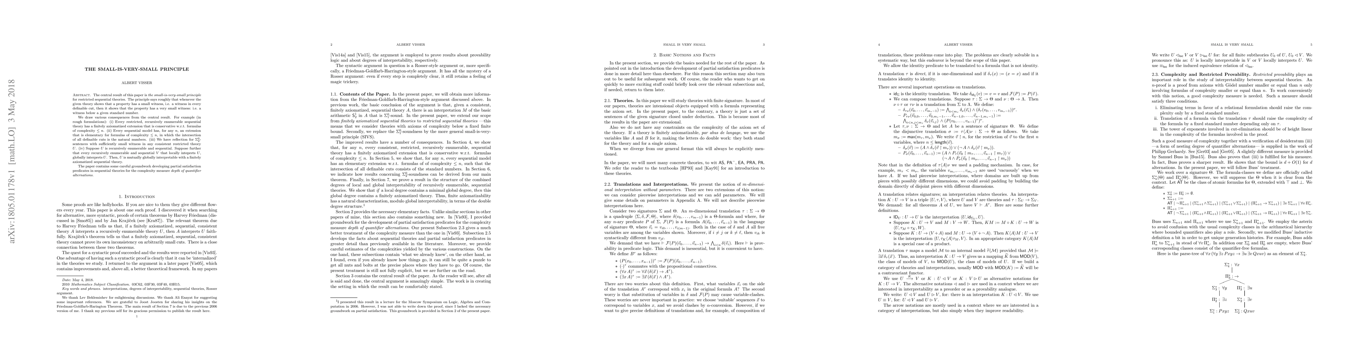 The central result of this paper is the small-is-very-small principle for restricted sequential theories. The principle says roughly that whenever the given theory shows that a property has a small witness, i.e. a witness in every definable cut, then it shows that the property has a very small witness: i.e. a witness below a given standard number. We draw various consequences from the central result. For example (in rough formulations): (i) Every restricted, recursively enumerable sequential theory has a finitely axiomatized extension that is conservative w.r.t. formulas of complexity $\leq n$. (ii) Every sequential model has, for any $n$, an extension that is elementary for formulas of complexity $\leq n$, in which the intersection of all definable cuts is the natural numbers. (iii) We have reflection for $\Sigma^0_2$-sentences with sufficiently small witness in any consistent restricted theory $U$. (iv) Suppose $U$ is recursively enumerable and sequential. Suppose further that every recursively enumerable and sequential $V$ that locally inteprets $U$, globally interprets $U$. Then, $U$ is mutually globally interpretable with a finitely axiomatized sequential theory. The paper contains some careful groundwork developing partial satisfaction predicates in sequential theories for the complexity measure depth of quantifier alternations.