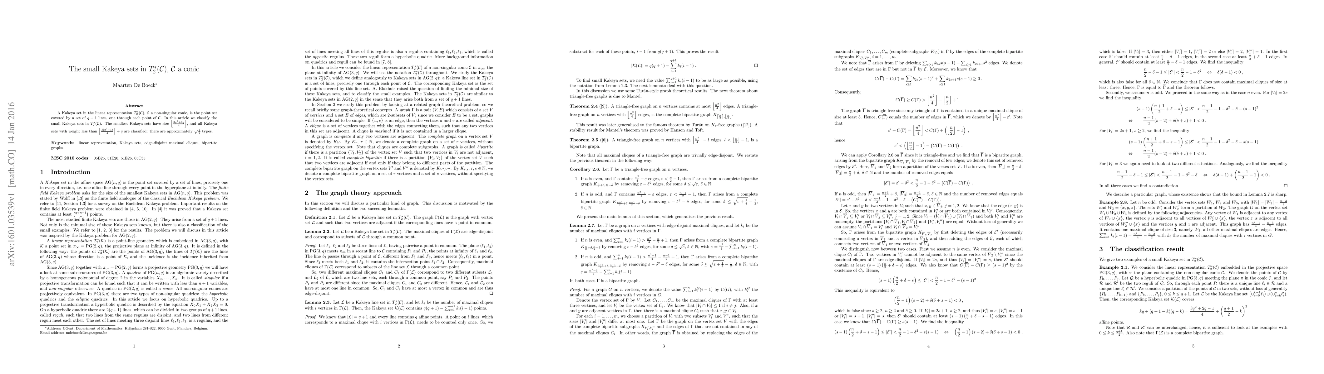 A Kakeya set in the linear representation $T^{*}_{2}(\mathcal{C})$, $\mathcal{C}$ a non-singular conic, is the point set covered by a set of $q+1$ lines, one through each point of $\mathcal{C}$. In this article we classify the small Kakeya sets in $T^{*}_{2}(\mathcal{C})$. The smallest Kakeya sets have size $\left\lfloor\frac{3q^{2}+2q}{4}\right\rfloor$, and all Kakeya sets with weight less than $\left\lfloor\frac{3(q^{2}-1)}{4}\right\rfloor+q$ are classified: there are approximately $\sqrt{\frac{q}{2}}$ types.