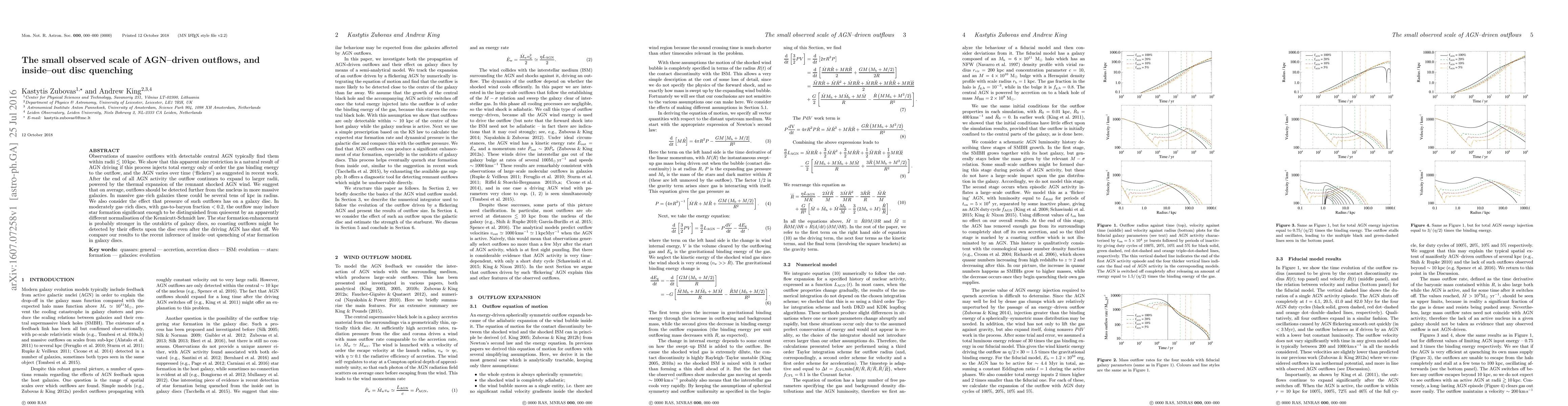 Observations of massive outflows with detectable central AGN typically find them within radii $\lesssim 10$ kpc. We show that this apparent size restriction is a natural result of AGN driving if this process injects total energy only of order the gas binding energy to the outflow, and the AGN varies over time (`flickers') as suggested in recent work. After the end of all AGN activity the outflow continues to expand to larger radii, powered by the thermal expansion of the remnant shocked AGN wind. We suggest that on average, outflows should be detected further from the nucleus in more massive galaxies. In massive gas--rich galaxies these could be several tens of kpc in radius. We also consider the effect that pressure of such outflows has on a galaxy disc. In moderately gas--rich discs, with gas-to-baryon fraction $< 0.2$, the outflow may induce star formation significant enough to be distinguished from quiescent by an apparently different normalisation of the Kennicutt-Schmidt law. The star formation enhancement is probably stronger in the outskirts of galaxy discs, so coasting outflows might be detected by their effects upon the disc even after the driving AGN has shut off. We compare our results to the recent inference of inside--out quenching of star formation in galaxy discs.