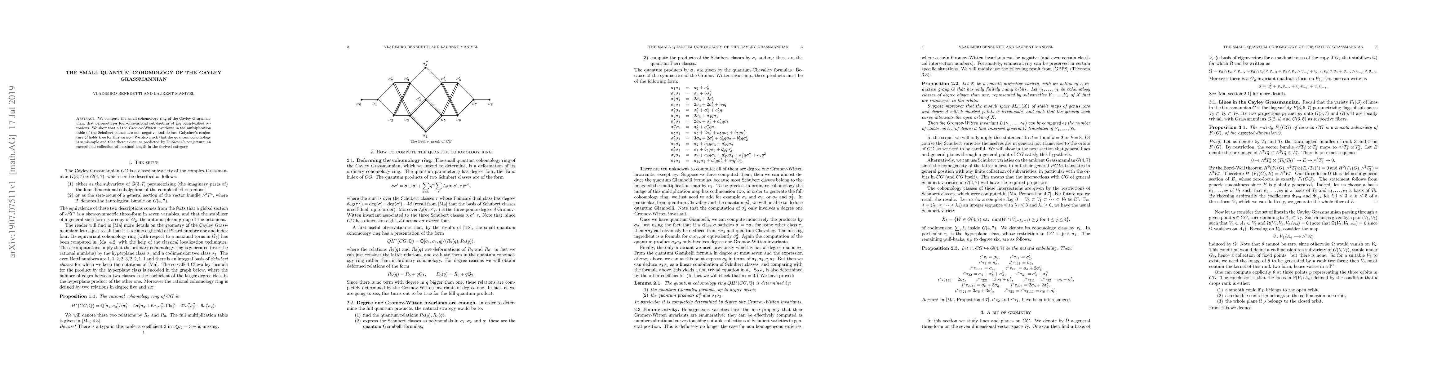 Researchers compute the small cohomology ring of the Cayley Grassmannian, showing it has non-negative Gromov-Witten invariants and deducing Golyshev's conjecture. The quantum cohomology is also semisimple and features an exceptional collection of maximal length.