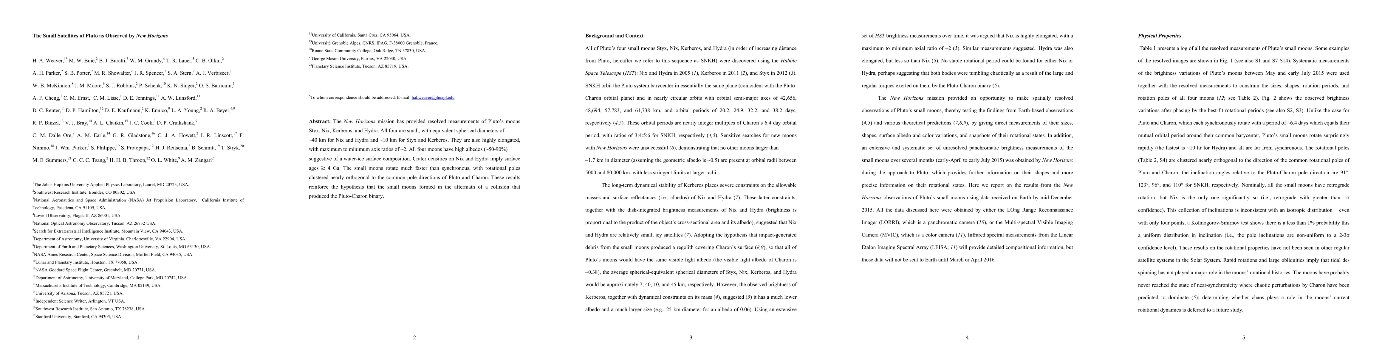 New Horizons mission reveals Pluto's small moons have high albedos, suggesting a water-ice surface composition, and rotate faster than synchronous orbits, supporting the hypothesis of a collision that formed them.