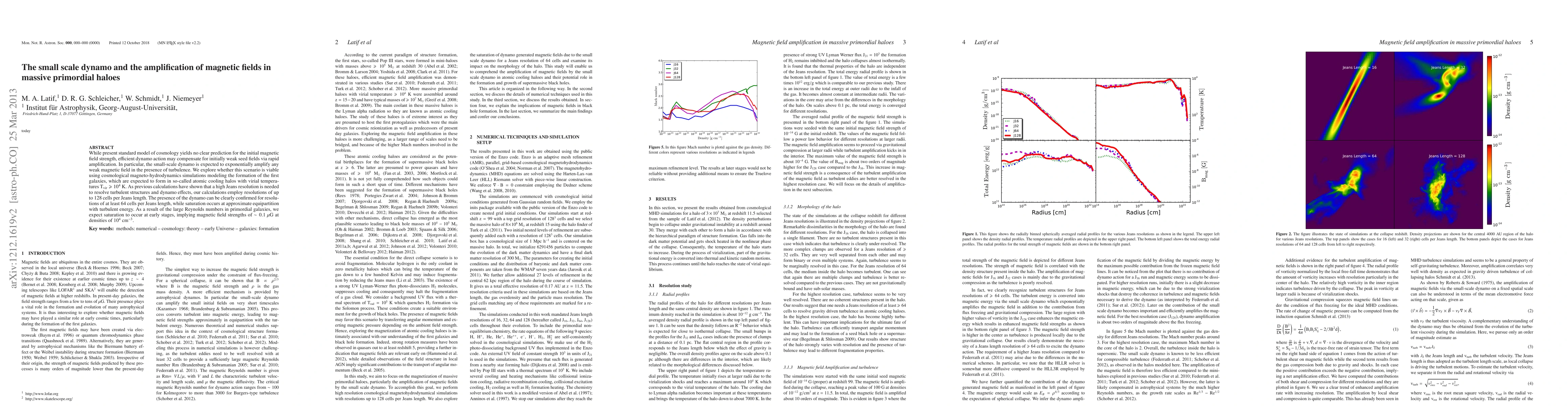This paper investigates the viability of the small-scale dynamo mechanism in amplifying weak initial magnetic fields in massive primordial haloes using high-resolution cosmological magneto-hydrodynamics simulations. The results confirm the dynamo's presence at resolutions of at least 64 cells per Jeans length, leading to magnetic field strengths of approximately 0.1 μG in early-stage primordial galaxies.