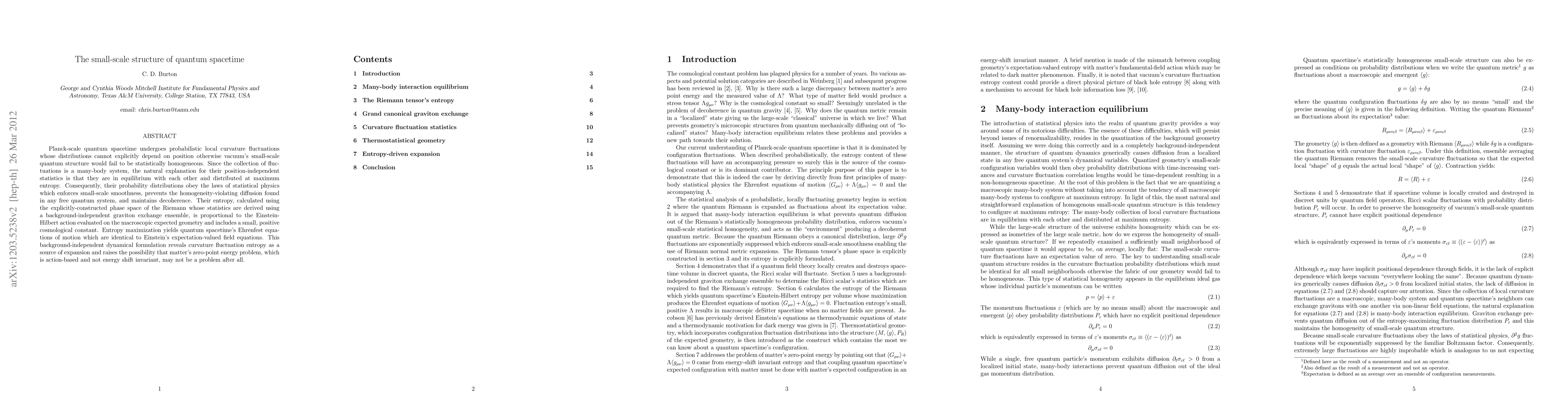 Planck-scale quantum spacetime undergoes probabilistic local curvature fluctuations whose distributions cannot explicitly depend on position otherwise vacuum's small-scale quantum structure would fail to be statistically homogeneous. Since the collection of fluctuations is a many-body system, the natural explanation for their position-independent statistics is that they are in equilibrium with each other and distributed at maximum entropy. Consequently, their probability distributions obey the laws of statistical physics which enforces small-scale smoothness, prevents the homogeneity-violating diffusion found in any free quantum system, and maintains decoherence. Their entropy, calculated using the explicitly-constructed phase space of the Riemann whose statistics are derived using a background-independent graviton exchange ensemble, is proportional to the Einstein-Hilbert action evaluated on the macroscopic expected geometry and includes a small, positive cosmological constant. Entropy maximization yields quantum spacetime's Ehrenfest equations of motion which are identical to Einstein's expectation-valued field equations. This background-independent dynamical formulation reveals curvature fluctuation entropy as a source of expansion and raises the possibility that matter's zero-point energy problem, which is action-based and not energy shift invariant, may not be a problem after all.
