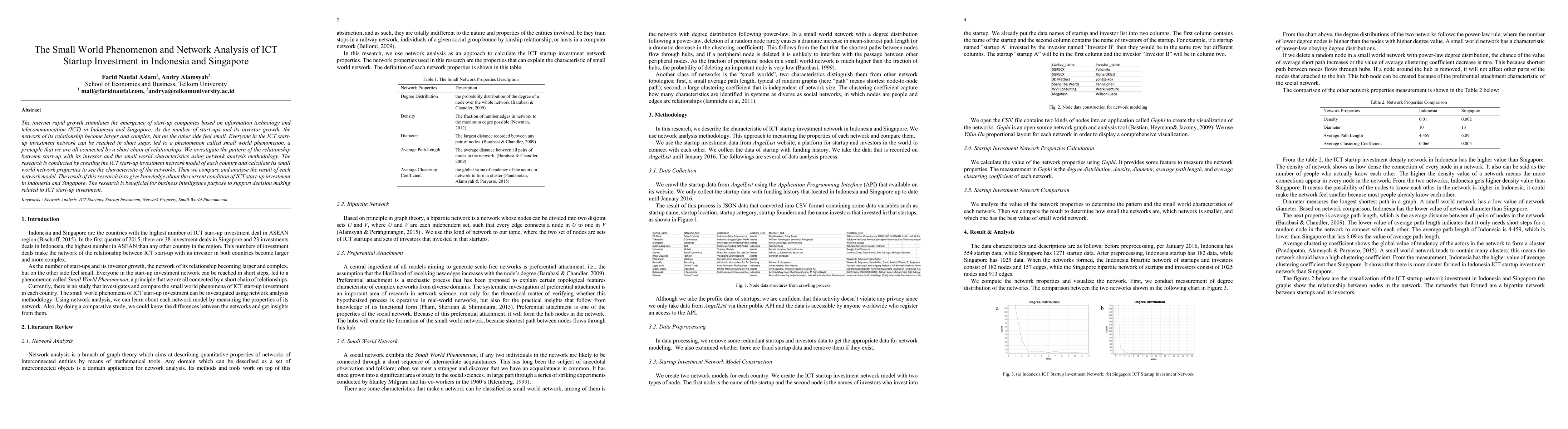 This study analyzes the network of ICT startup investments in Indonesia and Singapore, finding that they exhibit small-world characteristics, where individuals can reach each other in a short chain of relationships.