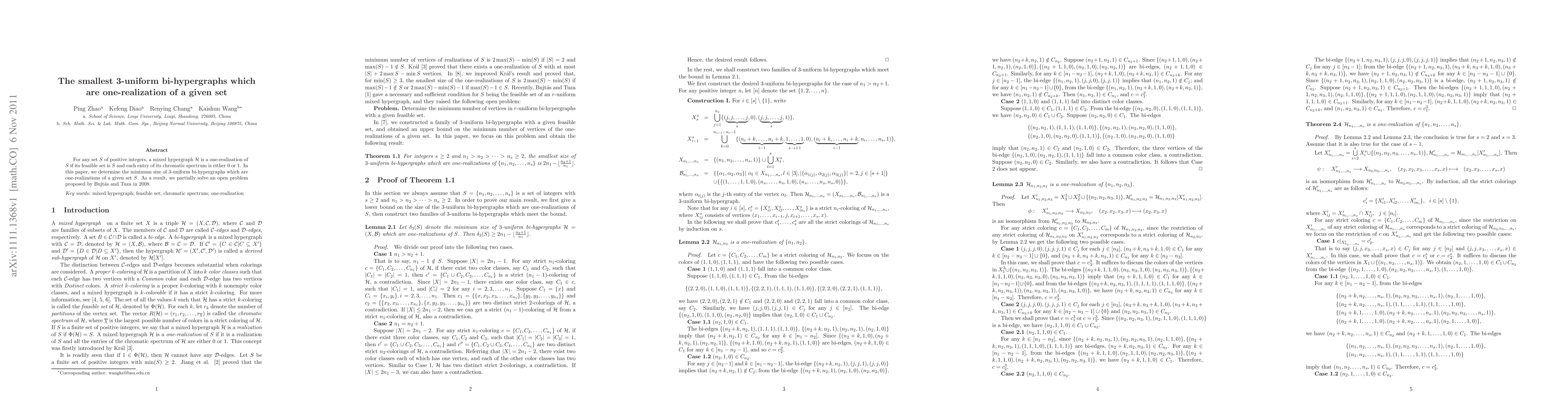 For any set $S$ of positive integers, a mixed hypergraph ${\cal H}$ is a one-realization of $S$ if its feasible set is $S$ and each entry of its chromatic spectrum is either 0 or 1. In this paper, we determine the minimum size of 3-uniform bi-hypergraphs which are one-realizations of a given set $S$. As a result, we partially solve an open problem proposed by Bujt$\acute{\rm a}$s and Tuza in 2008.