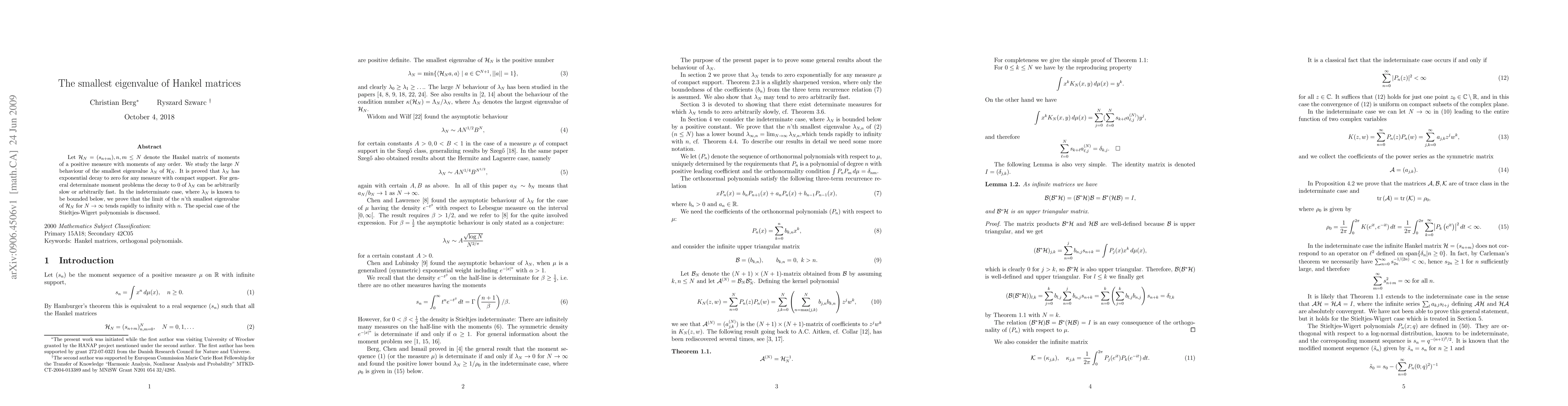 The paper provides rigorous mathematical proofs for the decay behavior of the smallest eigenvalue of Hankel matrices, extending previous results and characterizing the behavior for both determinate and indeterminate moment problems.