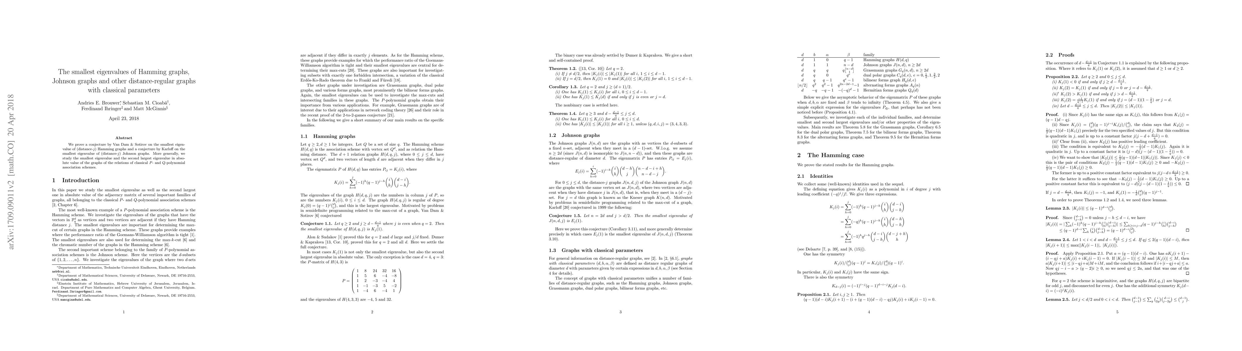 Researchers prove conjectures on smallest eigenvalues of Hamming graphs and Johnson graphs, finding they are 1/2 for specific distance regimes, with implications for understanding graph properties.