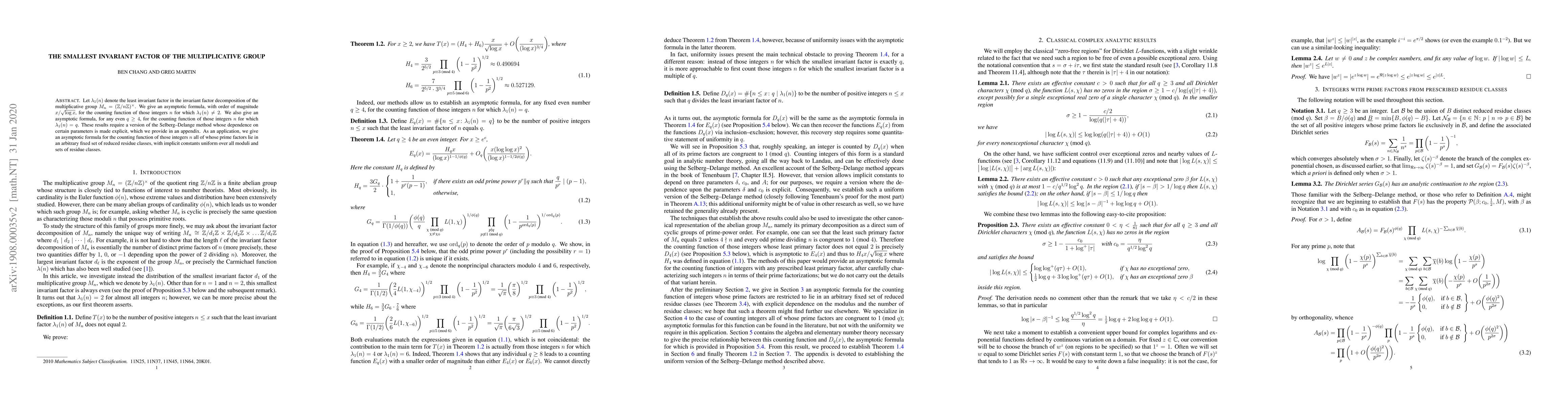 The paper employs a version of the Selberg-Delange method, with explicit dependence on certain parameters, to analyze the smallest invariant factor of the multiplicative group.