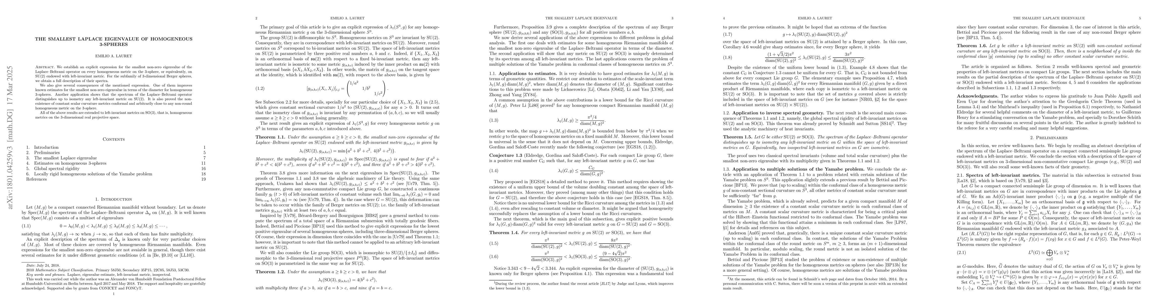 This research derives an explicit formula for the smallest non-zero eigenvalue of the Laplace-Beltrami operator on all homogeneous 3-sphere metrics, equivalent to SU(2) left-invariant metrics. It also fully describes the spectra for Berger spheres, improves diameter-based eigenvalue estimates, and demonstrates that the Laplace-Beltrami operator's spectrum uniquely identifies left-invariant metrics on SU(2). The study further proves the non-existence of constant scalar curvature metrics conformal to non-round homogeneous metrics on the 3-sphere, extending these findings to left-invariant metrics on SO(3).
