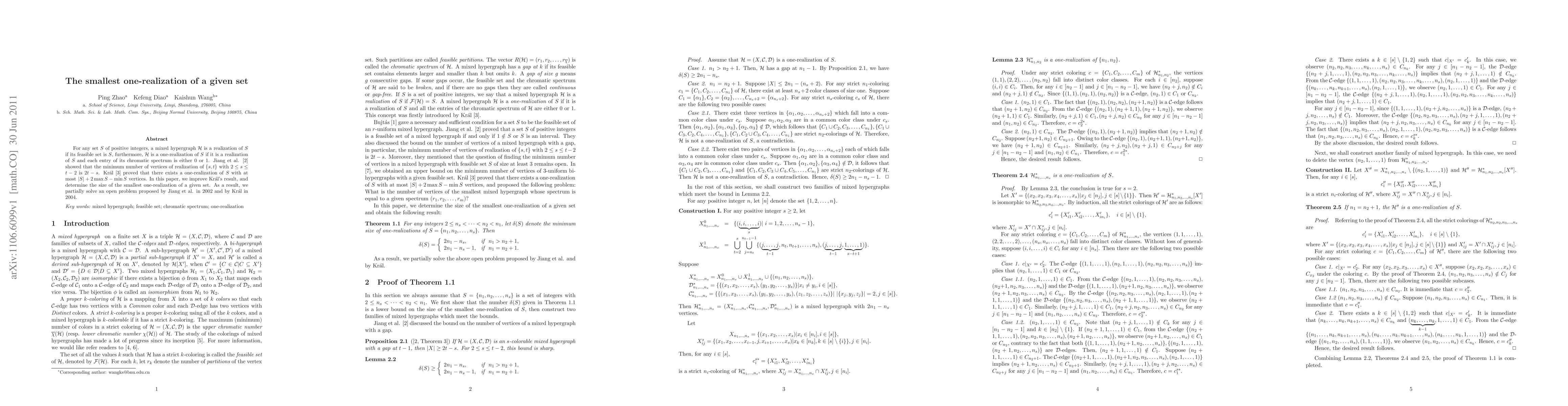For any set $S$ of positive integers, a mixed hypergraph ${\cal H}$ is a realization of $S$ if its feasible set is $S$, furthermore, ${\cal H}$ is a one-realization of $S$ if it is a realization of $S$ and each entry of its chromatic spectrum is either 0 or 1. Jiang et al. \cite{Jiang} showed that the minimum number of vertices of realization of $\{s,t\}$ with $2\leq s\leq t-2$ is $2t-s$. Kr$\acute{\rm a}$l \cite{Kral} proved that there exists a one-realization of $S$ with at most $|S|+2\max{S}-\min{S}$ vertices. In this paper, we improve Kr$\acute{\rm a}$l's result, and determine the size of the smallest one-realization of a given set. As a result, we partially solve an open problem proposed by Jiang et al. in 2002 and by Kr$\acute{\rm a}$l in 2004.
