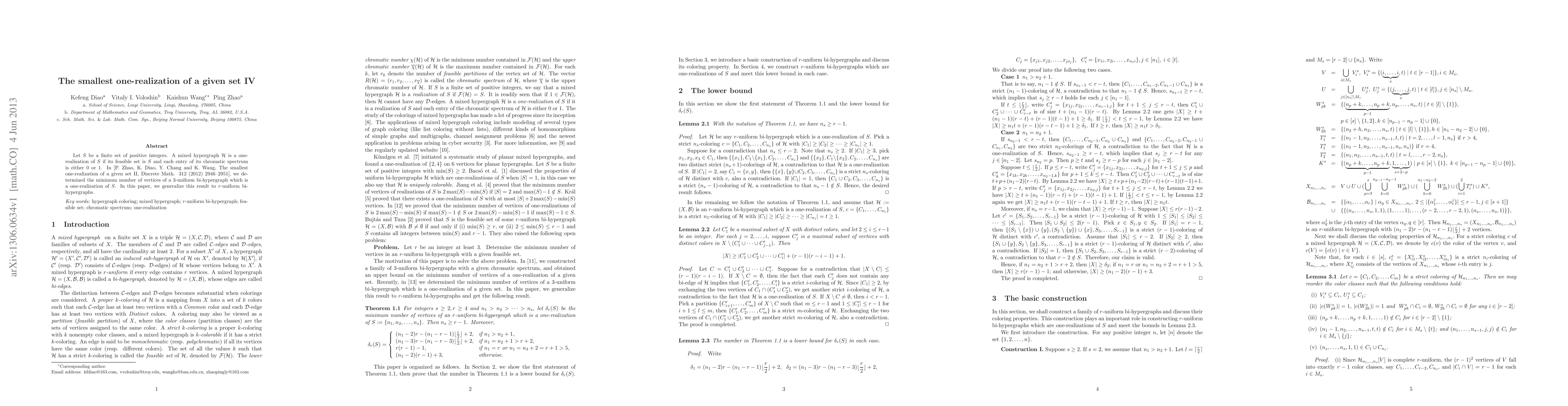 Let $S$ be a finite set of positive integers. A mixed hypergraph ${\cal H}$ is a one-realization of $S$ if its feasible set is $S$ and each entry of its chromatic spectrum is either 0 or 1. In [P. Zhao, K. Diao, Y. Chang and K. Wang, The smallest one-realization of a given set \uppercase\expandafter{\romannumeral2}, Discrete Math. 312 (2012) 2946--2951], we determined the minimum number of vertices of a 3-uniform bi-hypergraph which is a one-realization of $S$. In this paper, we generalize this result to $r$-uniform bi-hypergraphs.