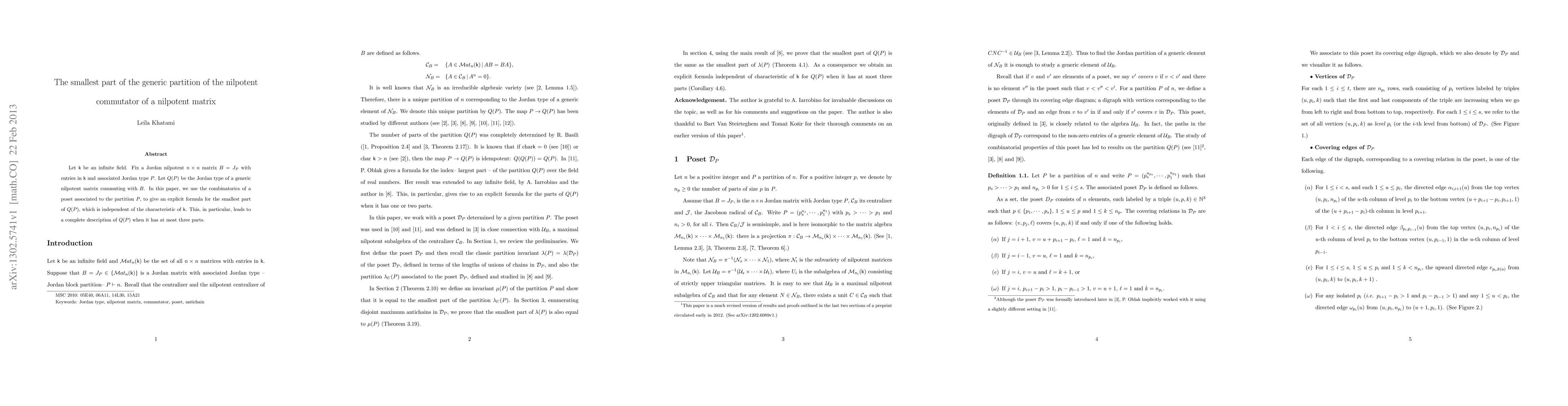 Let $k$ be an infinite field. Fix a Jordan nilpotent $n$ by $n$ matrix $B = J_P$ with entries in $k$ and associated Jordan type $P$. Let $Q(P)$ be the Jordan type of a generic nilpotent matrix commuting with $B$. In this paper, we use the combinatorics of a poset associated to the partition $P$, to give an explicit formula for the smallest part of $Q(P)$, which is independent of the characteristic of $k$. This, in particular, leads to a complete description of $Q(P)$ when it has at most three parts.