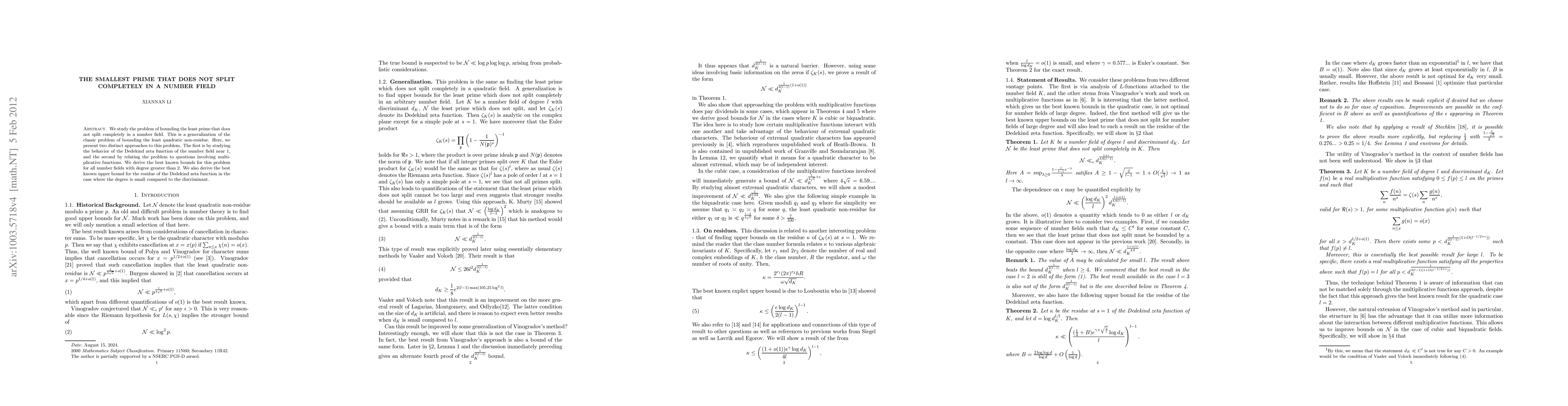 This research derives improved bounds for the smallest prime that doesn't split completely in number fields (higher degree analog of quadratic non-residues), using Dedekind zeta function analysis and multiplicative function questions. It also establishes the best upper bound for small degree fields relative to discriminant.