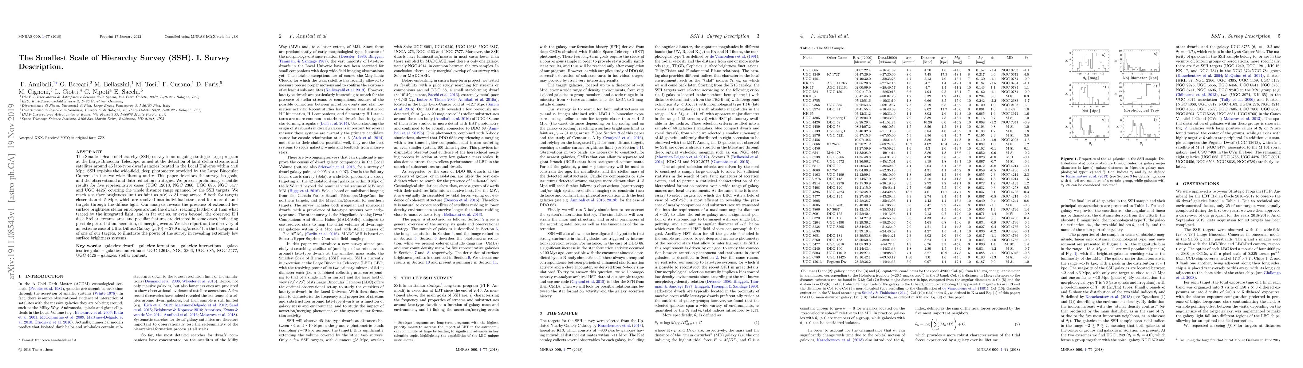 The Smallest Scale of Hierarchy (SSH) survey is an ongoing strategic large program at the Large Binocular Telescope, aimed at the detection of faint stellar streams and satellites around 45 late-type dwarf galaxies located in the Local Universe within $\simeq$10 Mpc. SSH exploits the wide-field, deep photometry provided by the Large Binocular Cameras in the two wide filters $g$ and $r$. This paper describes the survey, its goals, and the observational and data reduction strategies. We present preliminary scientific results for five representative cases (UGC 12613, NGC 2366, UGC 685, NGC 5477 and UGC 4426) covering the whole distance range spanned by the SSH targets. We reach a surface brightness limit as faint as $\mu(r)\sim$ 31 mag arcsec$^{-2}$ both for targets closer than 4$-$5 Mpc, which are resolved into individual stars, and for more distant targets through the diffuse light. Our analysis reveals the presence of extended low surface brightness stellar envelopes around the dwarfs, reaching farther out than what traced by the integrated light, and as far out as, or even beyond, the observed HI disk. Stellar streams, arcs, and peculiar features are detected in some cases, indicating possible perturbation, accretion, or merging events. We also report on the discovery of an extreme case of Ultra Diffuse Galaxy ($\mu_g(0)=27.9$~mag/arcsec$^2$) in the background of one of our targets, to illustrate the power of the survey in revealing extremely low surface brightness systems.