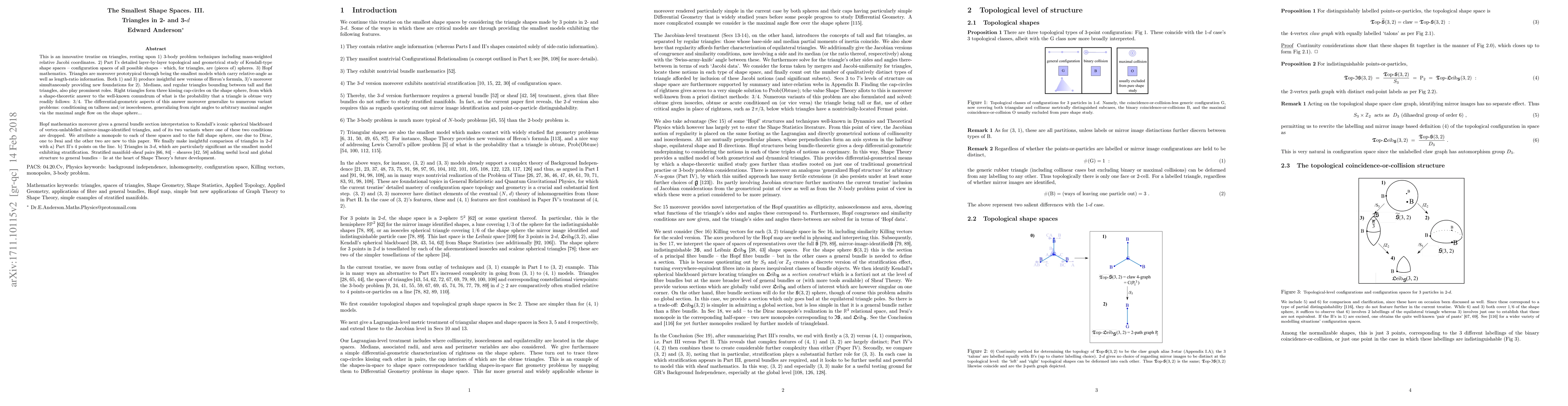 This is an innovative treatise on triangles, resting upon 1) 3-body problem techniques including mass-weighted relative Jacobi coordinates. 2) Part I's detailed layer-by-layer topological and geometrical study of Kendall-type shape spaces - configuration spaces of all possible shapes - which, for triangles, are (pieces of) spheres. 3) Hopf mathematics. Triangles are moreover prototypical through being the smallest models which carry relative-angle as well as length-ratio information. Both 1) and 3) produce insightful new versions of Heron's formula, 3)'s simultaneously providing new foundations for 2). Medians, and regular triangles bounding between tall and flat triangles, also play prominent roles. Right triangles form three kissing cap-circles on the shape sphere, from which a shape-theoretic answer to the well-known conundrum of what is the probability that a triangle is obtuse very readily follows: 3/4. The differential-geometric aspects of this answer moreover generalize to numerous variant problems. Hopf mathematics additionally gives a general bundle section interpretation to Kendall's iconic spherical blackboard of vertex-unlablelled mirror-image-identified triangles, and of its two variants where one of these two conditions are dropped. We attribute a monopole to each of these spaces and to the full shape sphere, one due to Dirac, one to Iwai and the other two are new to this paper. We finally make insightful comparison of triangles in 2-$d$ with a) Part II's 4 points on the line. b) Triangles in 3-$d$, which are particularly significant as the smallest model exhibiting stratification. Stratified manifold-sheaf pairs - sheaves adding useful local and global structure to general bundles - lie at the heart of Shape Theory's future development.