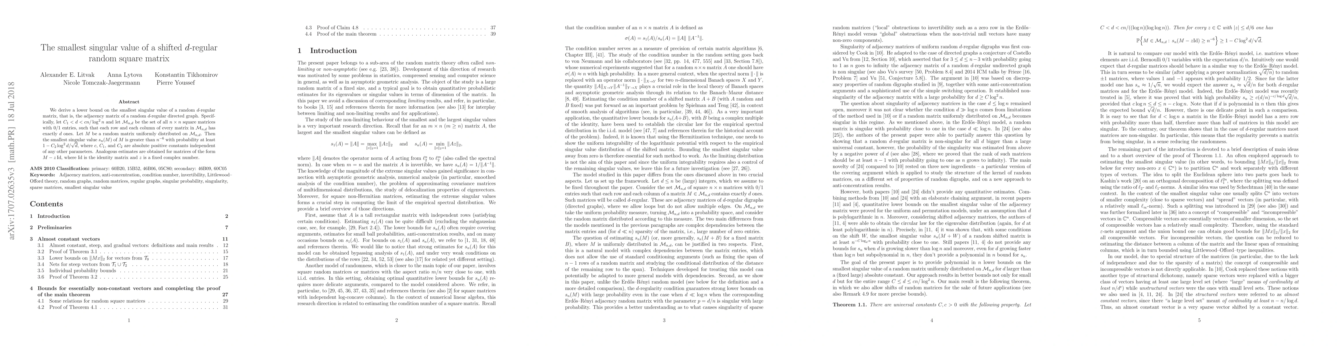 This paper establishes a lower bound on the smallest singular value of a $d$-regular random matrix, showing that it is greater than $c_2 n^{-6}$ with high probability, where $d$ is between $C_1$ and $c_1 n/\log^2 n$. The result holds with probability at least $1-C_2\log^2 d/\sqrt{d}$, independent of other parameters.