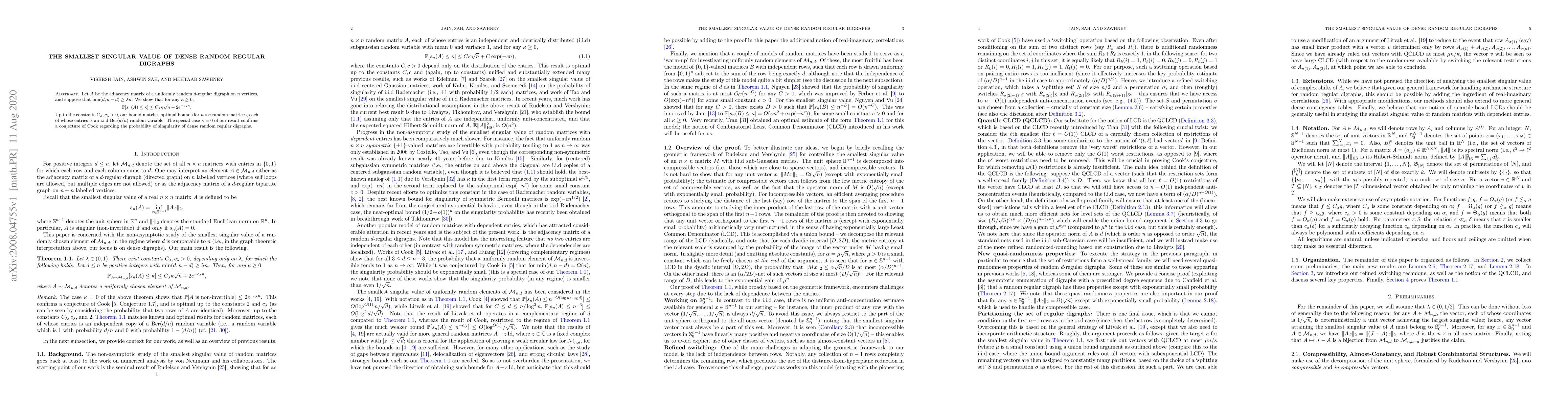 This paper investigates the smallest singular value of the adjacency matrix of dense random regular digraphs, proving an upper bound that matches optimal bounds for random matrices. The result confirms a conjecture about the probability of singularity for these digraphs.